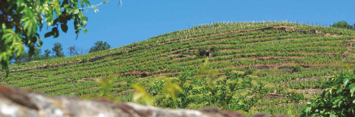 en pequeñas terrazas –¡con casi un kilómetro de muros de piedra!– que acumulan el calor permitiendo una perfecta maduración de la viognier.