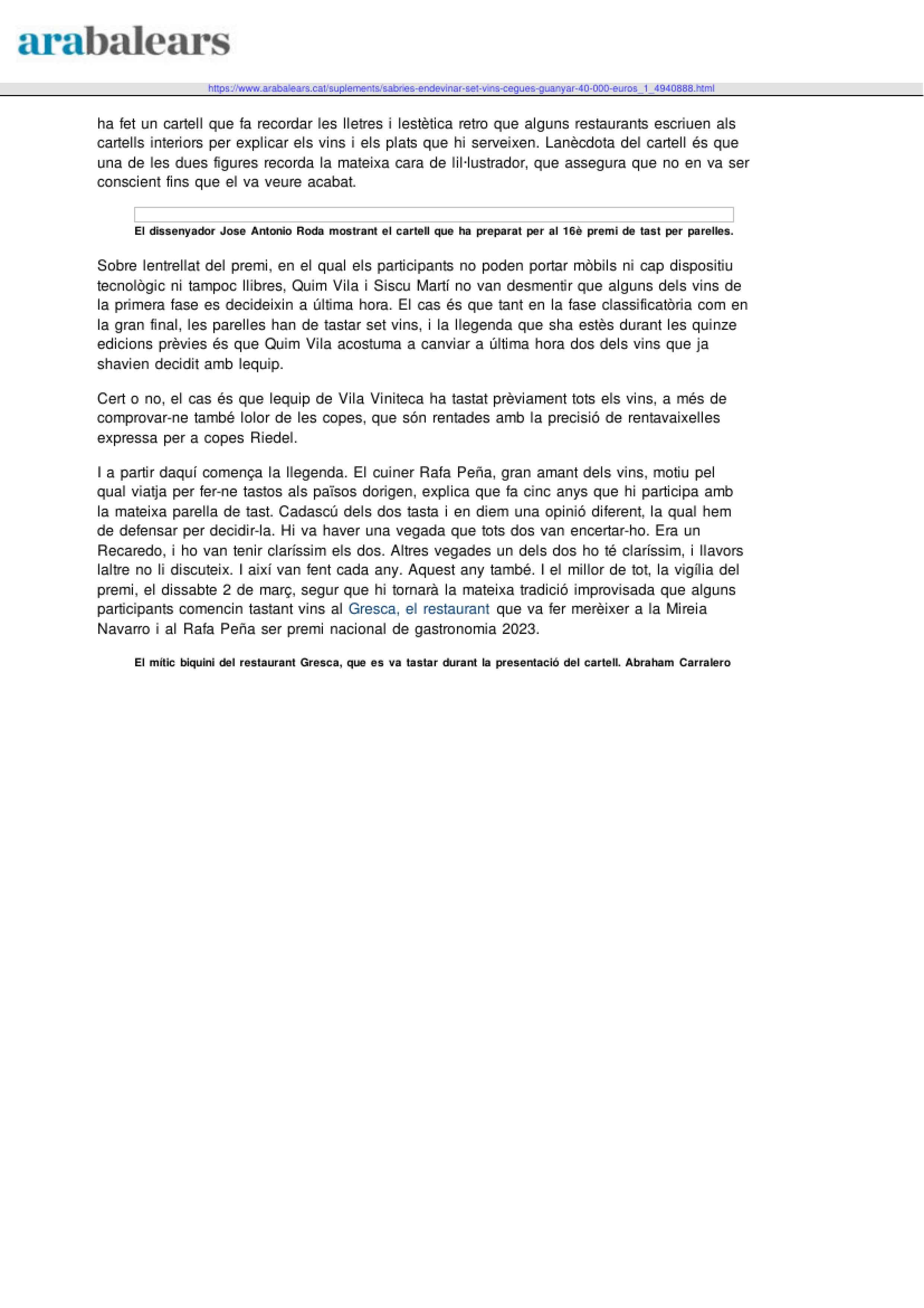 Pero eso no le impide poner en valor el nivel organizativo de Vila Viniteca: "¡No hay nada parecido en todo el mundo! Comparado con Vila Viniteca, por ejemplo, el Campeonato del Mundo, que se celebra en Francia, sería más cutre. ¡No usan tantas copas!".