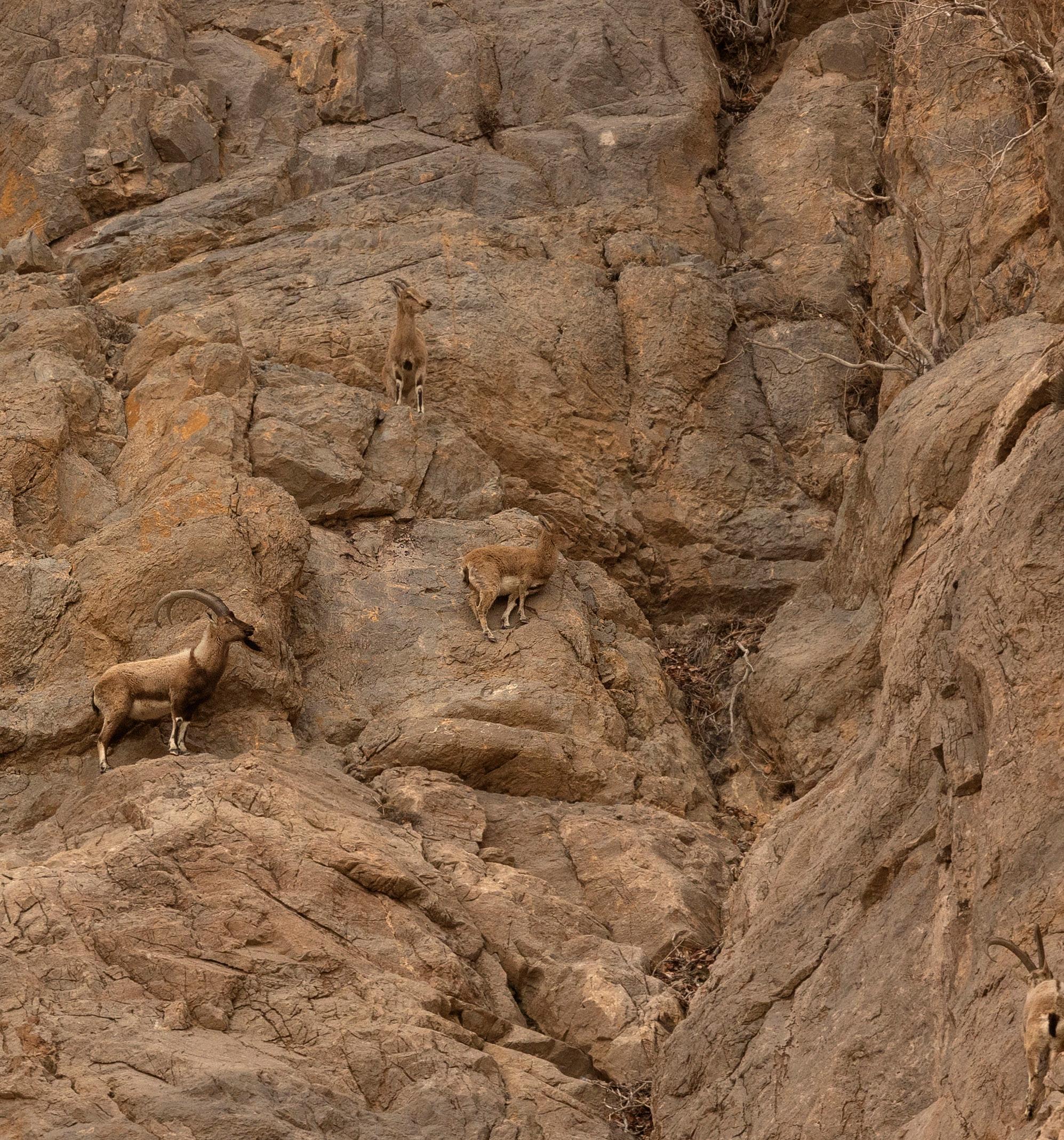 När vi kikar över krönet ser vi en liten flock hondjur och några unga bockar 200–300 meter nedanför oss. Inga gamla bockar visar sig, men Iman vill att vi ska vänta – ibland följer de kloka gamla hanarna flocken senare. Vi ligger stilla en halvtimme, men fler djur syns inte.