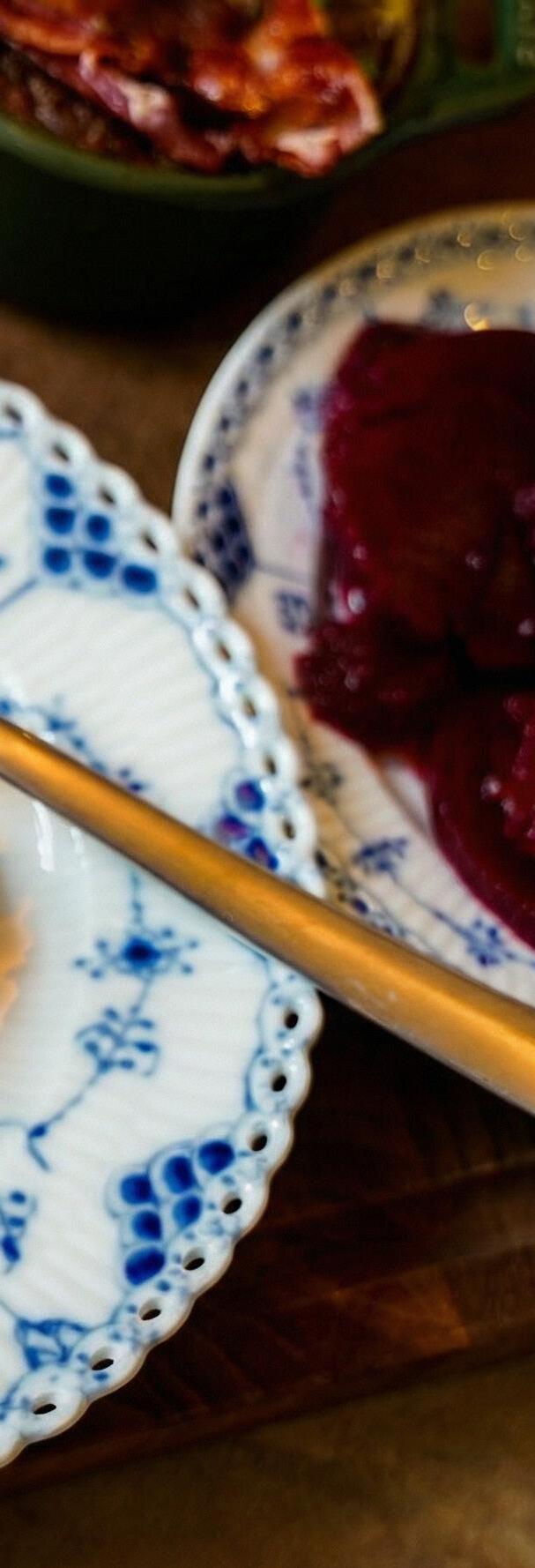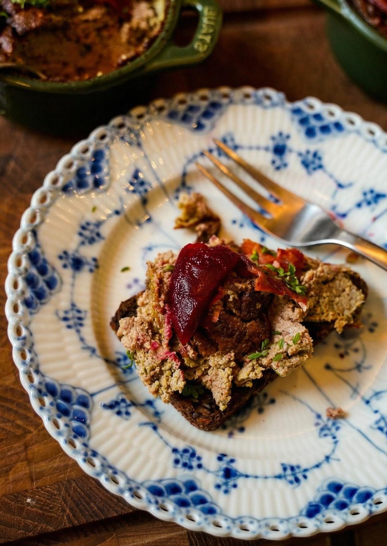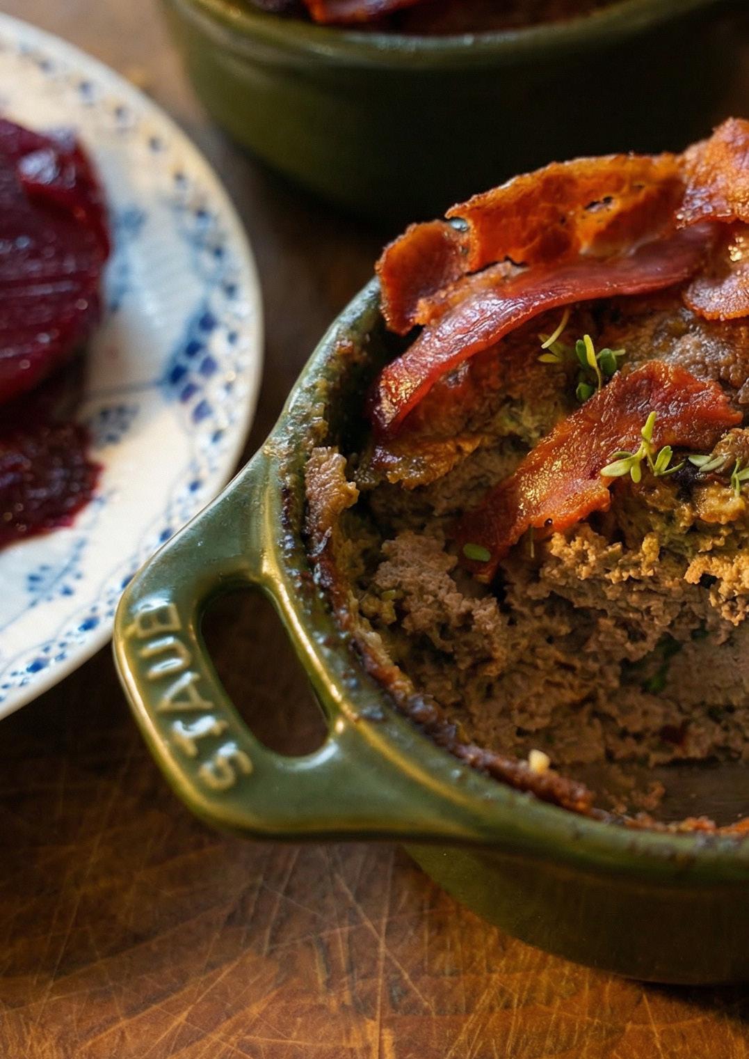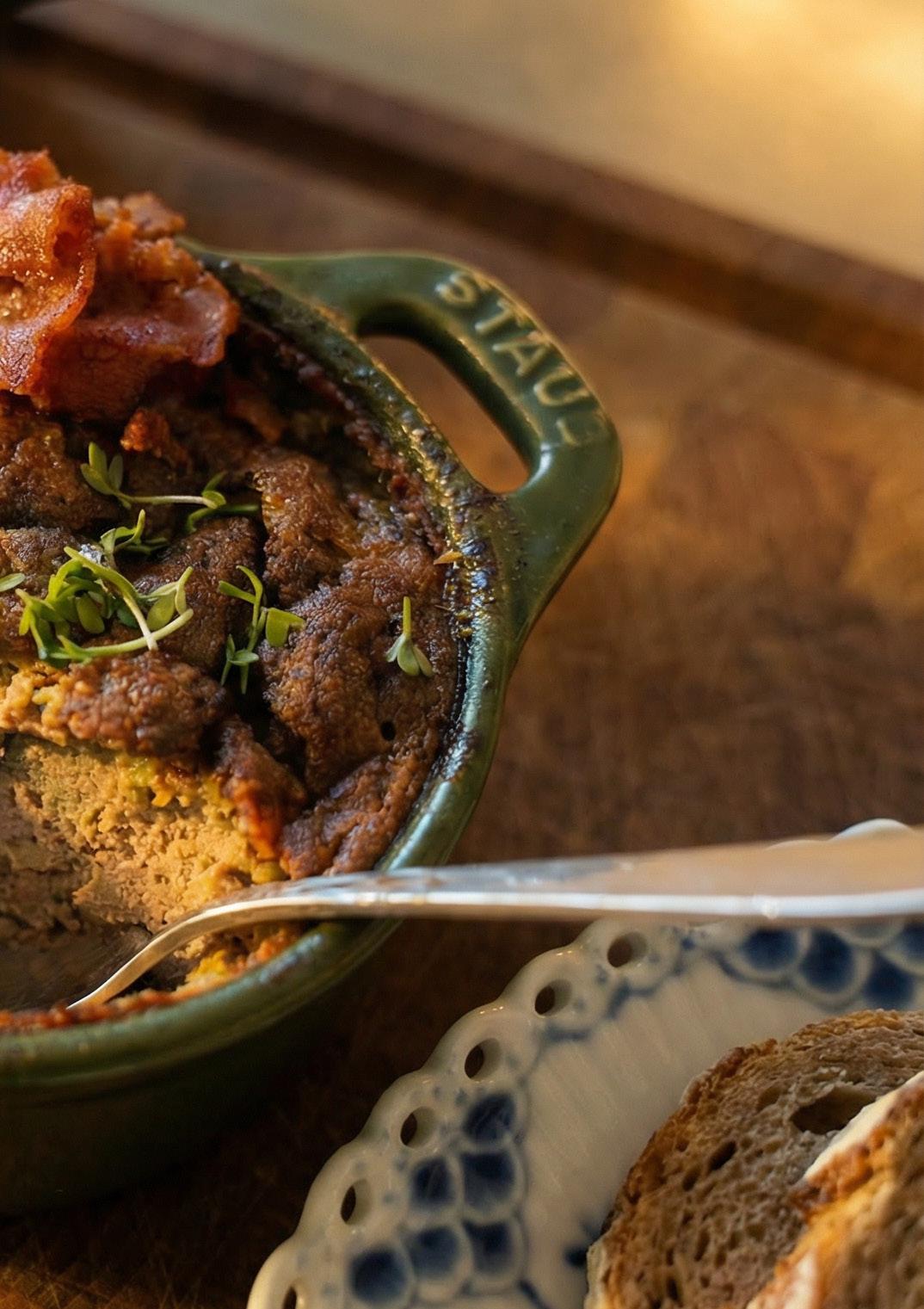 HON LÅTER HÄLSA ATT TILLAGNINGEN ÄR OKOMPLICERAD MEN KRÄVER LITE OMSORG. Löken får sakta mjukna i smör utan att ta färg, vilket bygger en mild och rund grund. Därefter mixas allt till en slät smet innan den försiktigt bakas i vattenbad i ugnen – en metod som gör att patén stannar krämig och inte blir torr. Patén passar lika bra på en grov smörgås som på ett dukat bord tillsammans med tillbehör.
