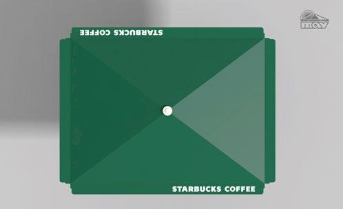 Erfolgreiches Marketing entscheidet sich vor Ort. Mit einer Bedruckung auf den Volants sind Sie immer auf Sichthöhe mit Ihren Kunden. Große Motive lassen sich auf dem Schirmdach auffällig platzieren – ganz egal, ob von unten oder von oben lesbar.