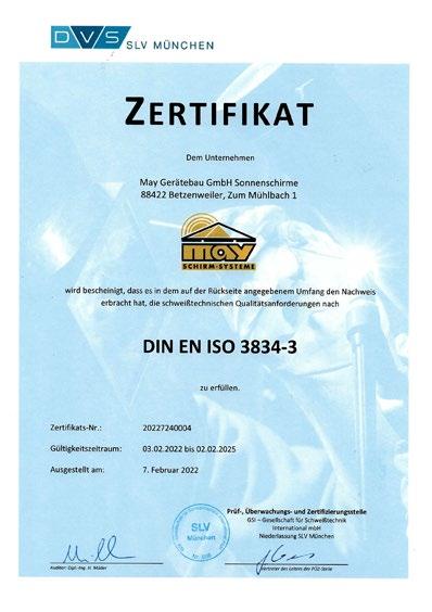 Es ist das Bestreben der Firma MAY, Produkte zu fertigen, die durch eine extrem lange Lebensdauer nachhaltig sind. Um diesen Qualitätsansprüchen gerecht zu werden ist die Firma MAY schweißzertifiziert. Stabile Schweißverbindungen sind ein wichtiges Qualitätsmerkmal, sowohl an den Schirmen als auch an den Befestigungselementen. Die DIN EN ISO 3834-3 garantiert eine ständige Kontrolle und dient als eine neutrale Grundlage für die Bewertung der Schweißqualität. Dieses Qualitätsmanagementsystem ist aufwendig, schafft aber ein zusätzliches Maß an Sicherheit. So werden verantwortungsvoll Produkte produziert, die ganzjährig bei Wind und Wetter halten.