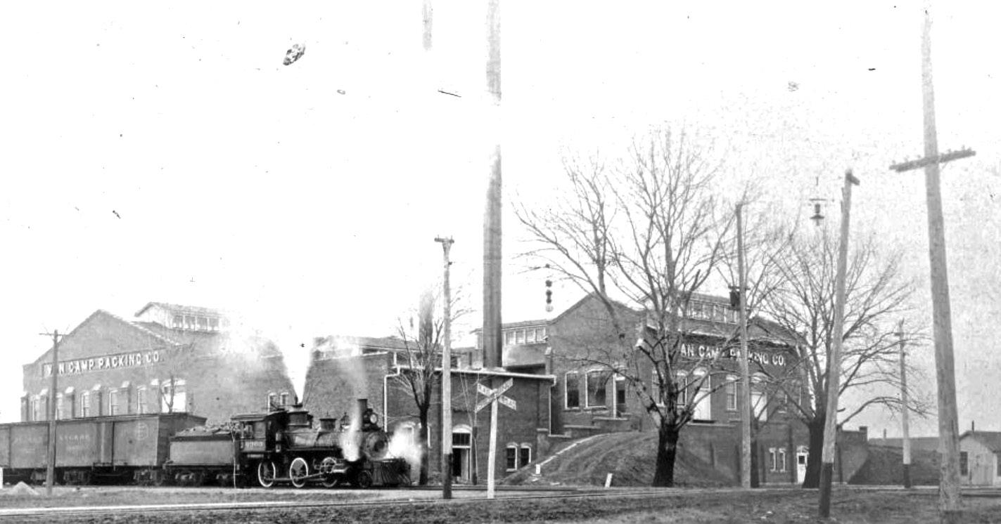 MILK EVAPORATING PLANT - In March 1909 the Van Camp Packing Company began production at this milk evaporating plant (or condensory) on East High Street in Bryan where the Cincinnati Northern Railroad and Toledo and Indiana interurban railway intersected. The condensory was the largest building in town at the time and was reportedly “the most modern, best-equipped milk evaporating plant in the United States.”