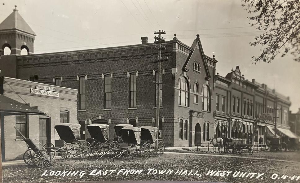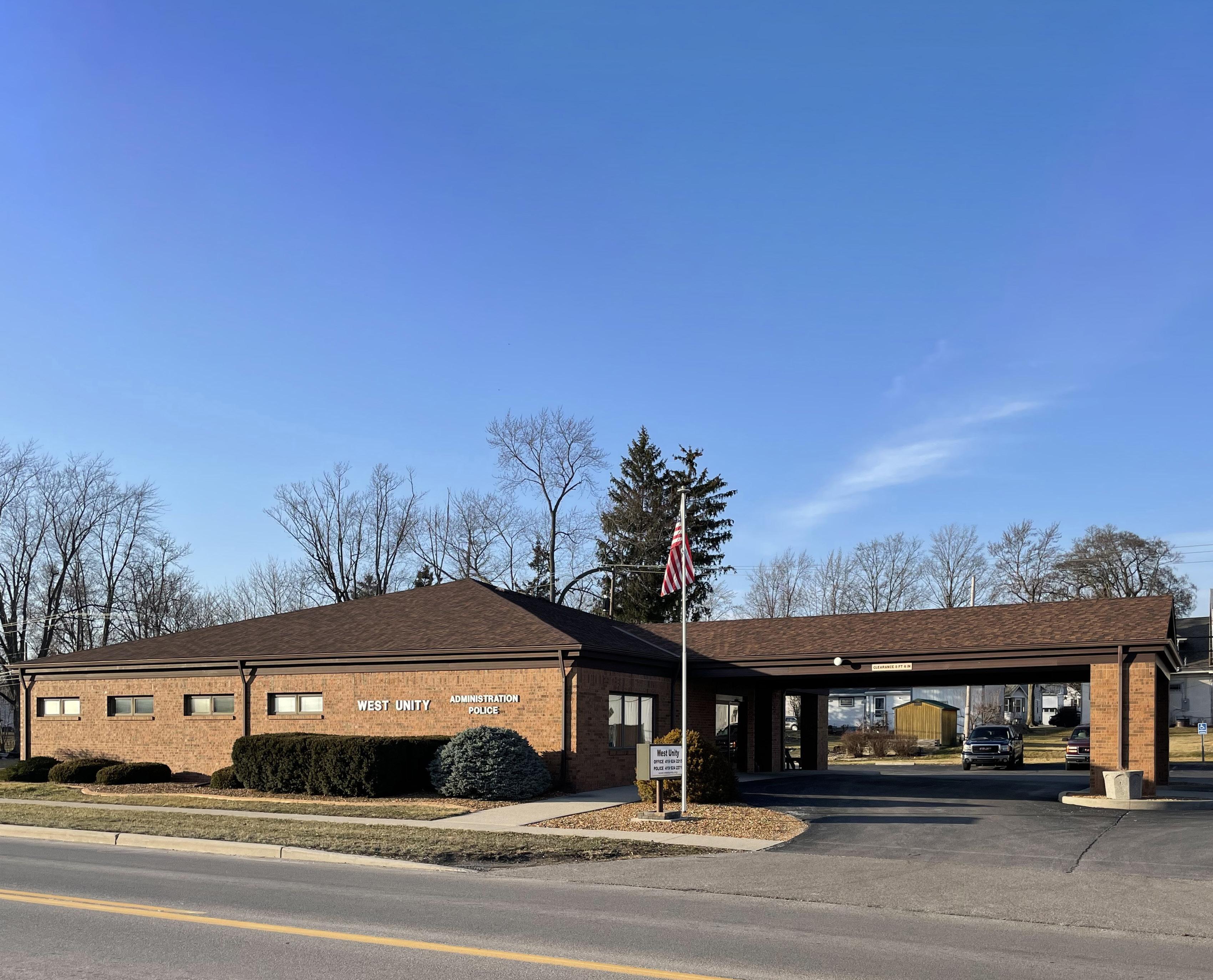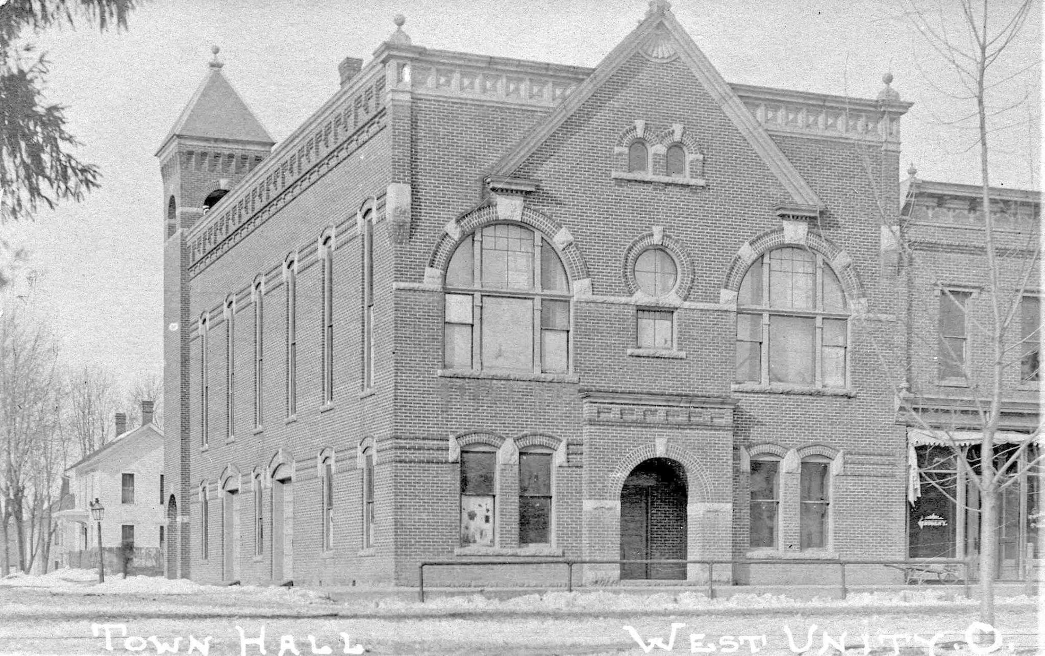 WEST UNITY TOWN HALL - West Unity’s town hall was constructed in 1894-95 at the northeast corner of Jackson and High streets. Council chambers, a community band room, fire department and village jail occupied the first floor. The second floor served as an auditorium and theatre for many years. Note the iron hitching rail in front. The building continued to serve as West Unity’s municipal headquarters following extensive alterations, including removal of its second floor until 2016.