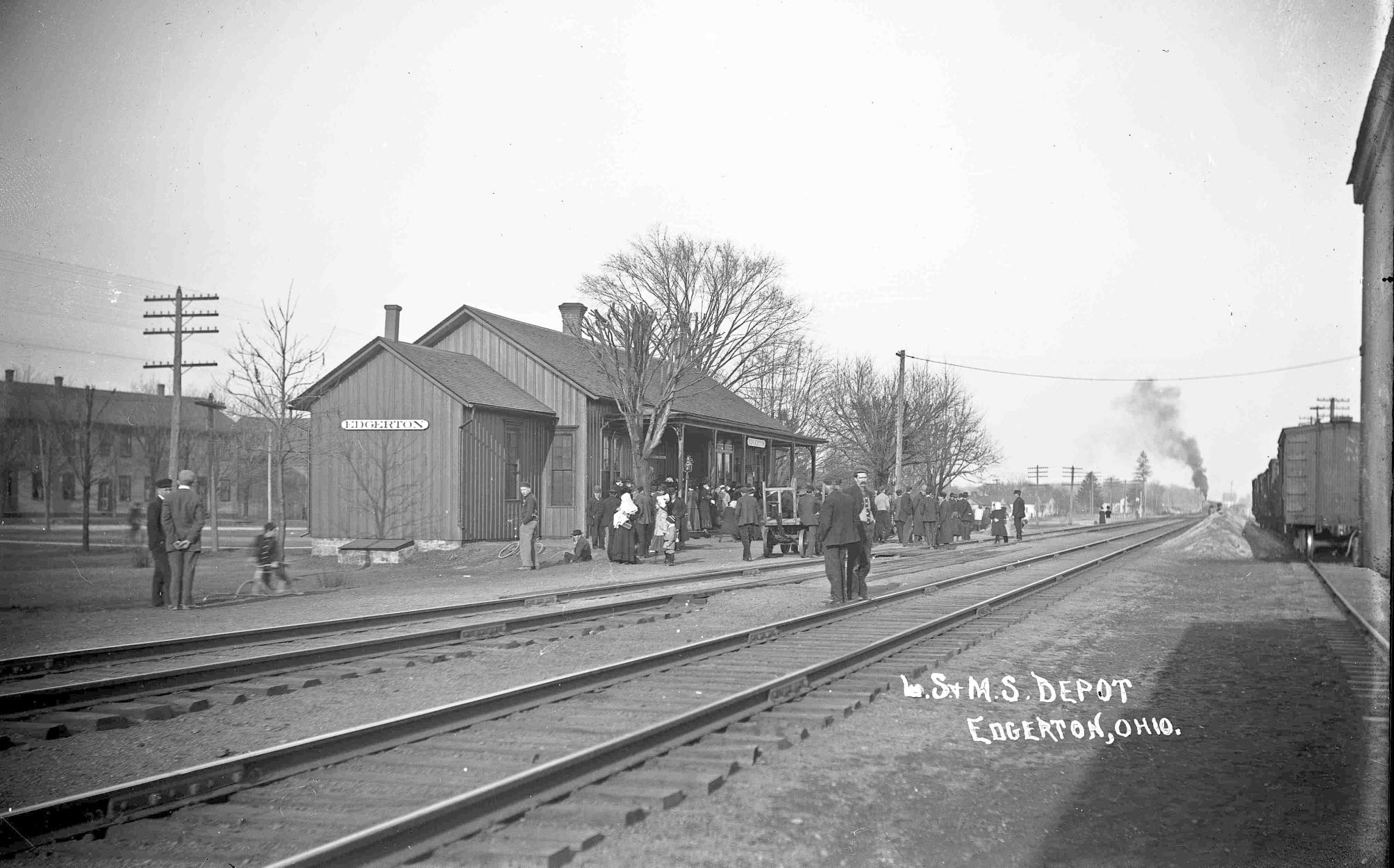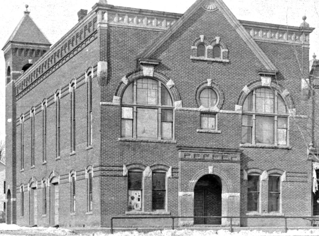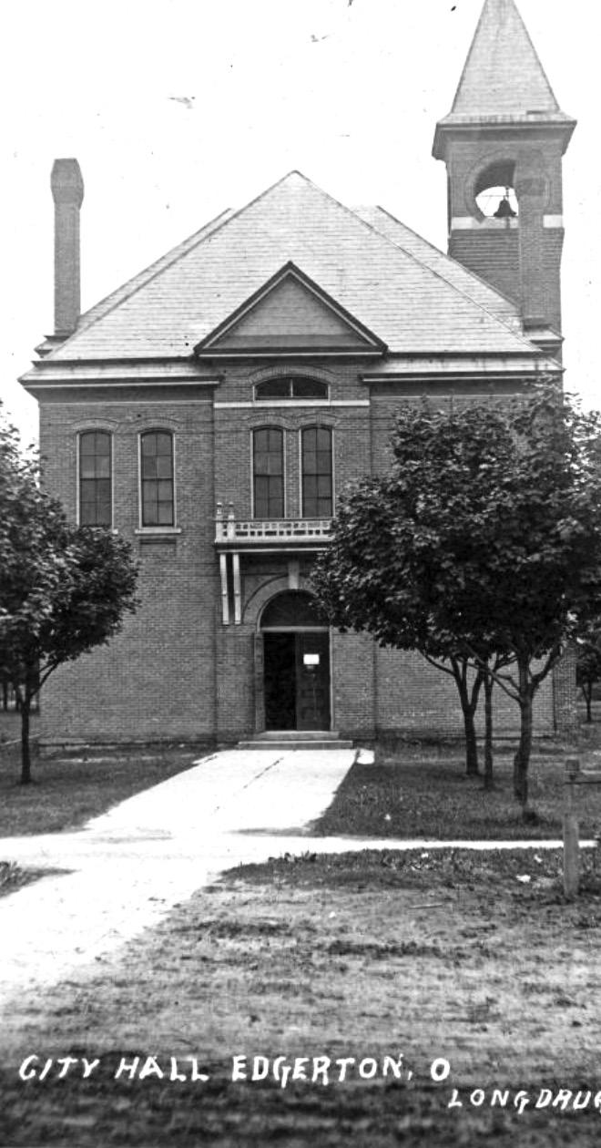 EDGERTON TOWN HALL - In 1884 this $8,000 town hall was erected jointly by Edgerton and St. Joseph Township. On August 15, 1884, the building’s cornerstone was laid “with imposing ceremonies,” and it was probably first occupied in late 1884 or early 1885. The brick structure featured a public hall that hosted speakers, entertainment, and high school commencement exercises. Iron hitching rails on the building’s north and west sides were removed in 1946.
