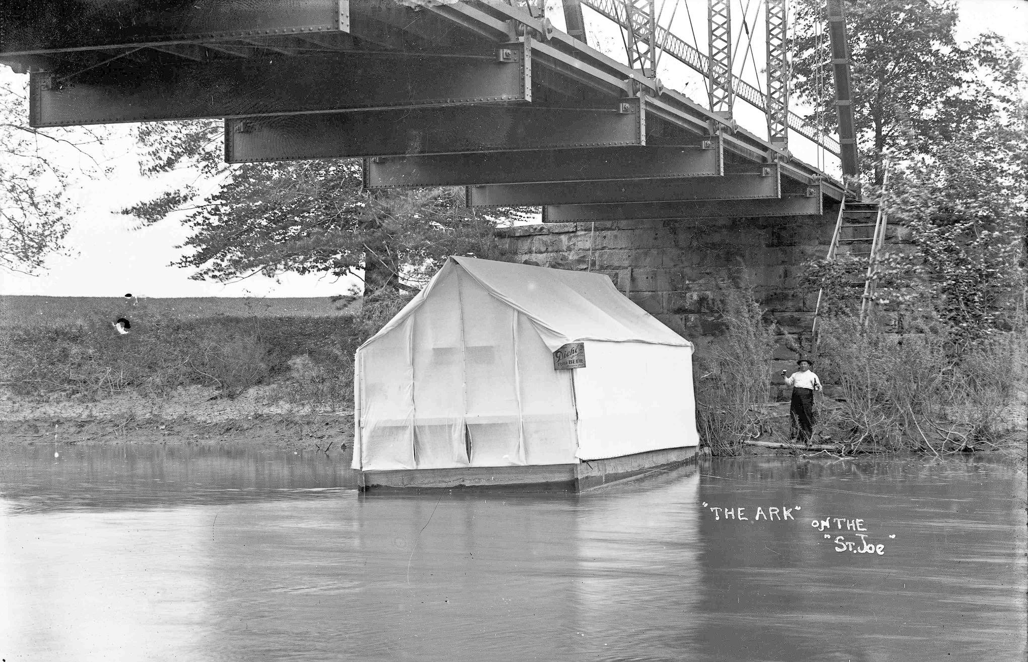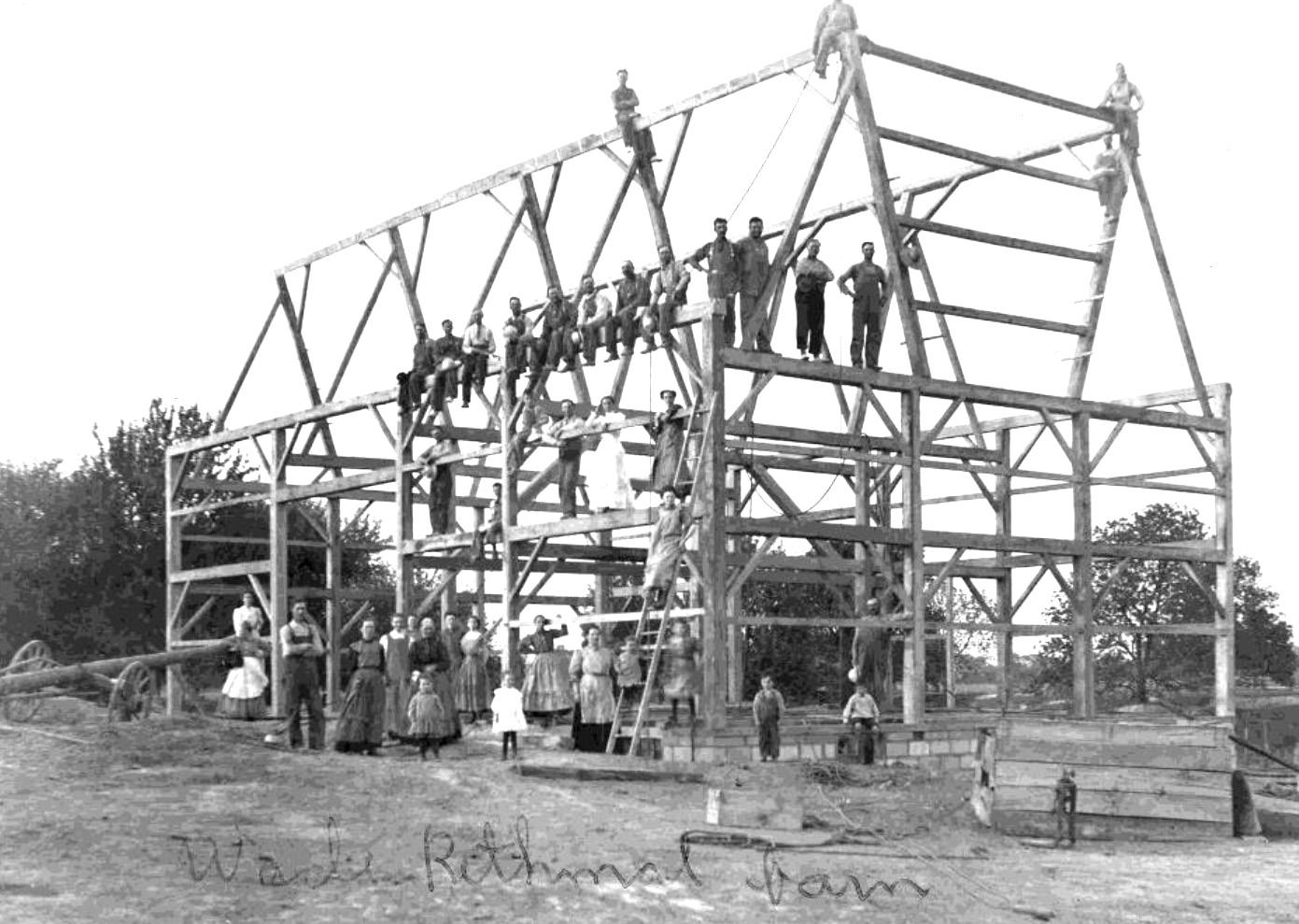 BARN RAISING - Local farmers have long used barns to shelter livestock and store hay, straw, grain and farm equipment. This May 1911 photograph shows a barn raising on the Wade Rethmel farm south of Evansport. Barn raisings were community events—neighbors, friends and family members of all ages gathered to construct a barn. While men built the barn, youngsters carried water and fetched needed items, and women prepared bountiful meals for participants.