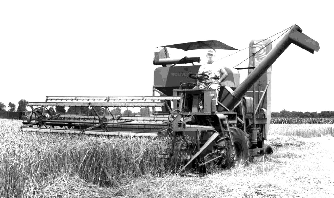 EARLY COMBINES - By the 1930s combines—so-called because they combined the functions of a reaper and threshing machine—were used locally to harvest grain. Early combines were drawn by tractors; this circa 1953 photograph shows a self-propelled Oliver combine. (WCPL Photographic Archives.)