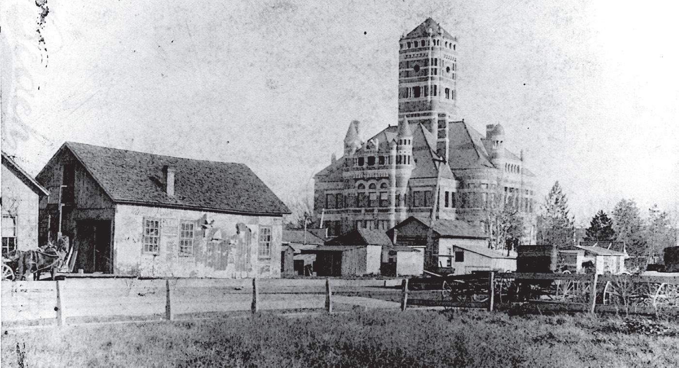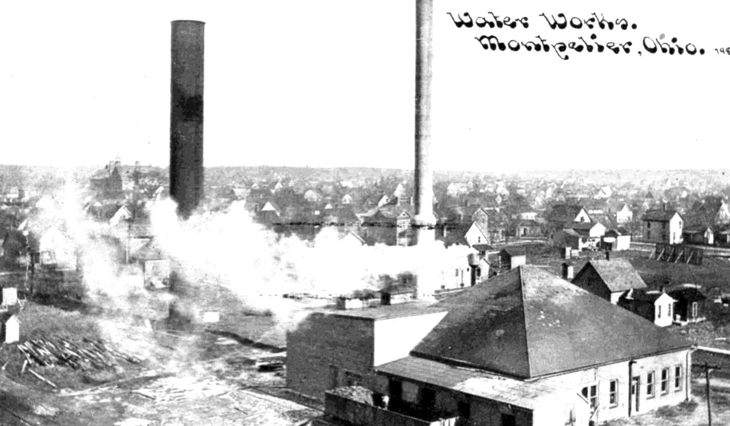 MONTPELIER UTILITIES - In August 1895 Montpelier awarded contracts for this power plant and waterworks pumping station at Depot and Bryant streets. The brick building housed two coal-fired boilers to power electric generators. Three wells supplied water to nearly five miles of water mains and 63 fire hydrants. The 110-foot steel standpipe on the left provided water storage and stabilized pressure. On December 14, 1895, streetlights were switched on for the first time.