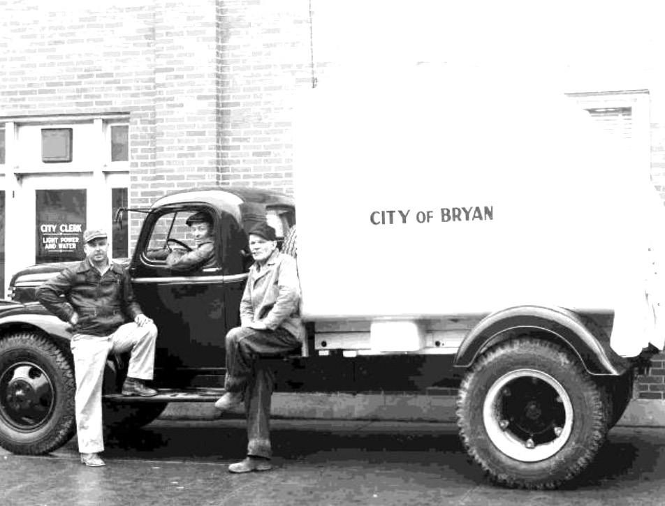 GARBAGE TRUCK - In 1946 the City of Bryan purchased this “RefuseGetter” to replace an uncovered garbage truck. Collectors placed refuse in the rear hopper and as the truck moved forward, the hopper rose to the top of the truck and dumped refuse into the enclosed box. Shown with the Refuse-Getter are, left to right, assistant street commissioner Vernon Coil, city fire truck driver Guy Eager and street commissioner Burt Rosendaul.