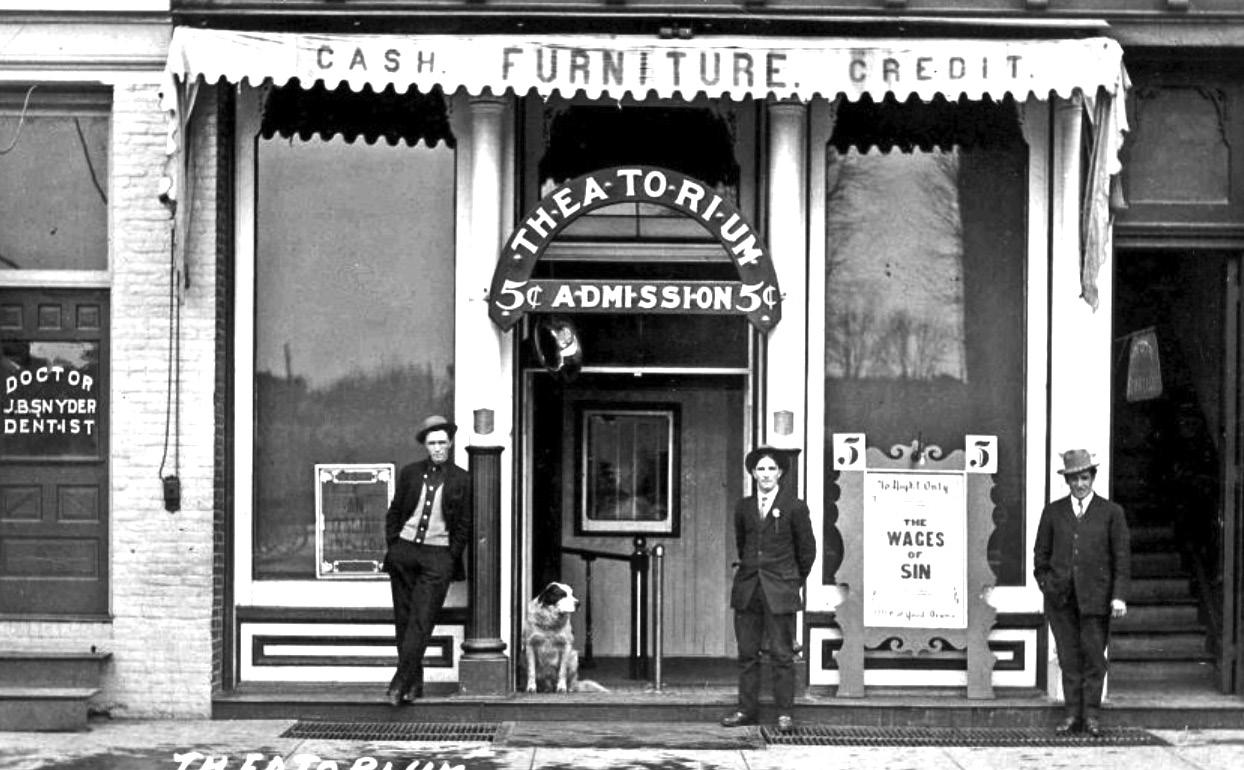 THEATRE - In 1907 J. C. Garnette, a professional photographer from Stryker, opened the Bryan Theatorium on the north side of the courthouse square. In 1908 the Bryan Democrat reported that “in addition to a thousand feet of film, a good vocalist sings illustrated songs and all for the small sum of five cents. Mothers with children can rest assured that nothing will be seen that could offend the most particular.” (WCPL Photographic Archives.)