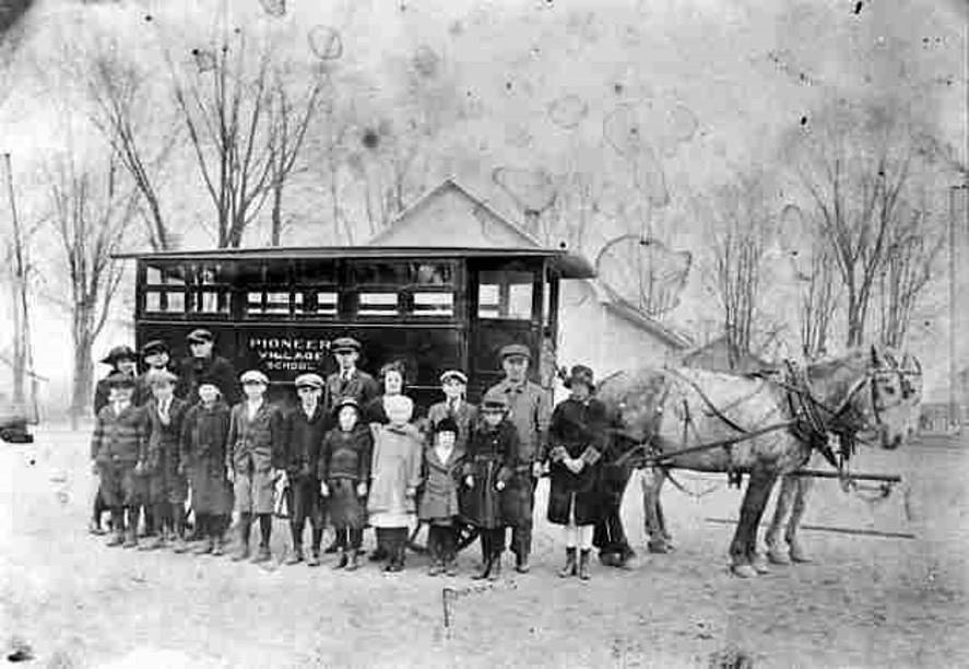 SCHOOL TRANSPORTATION - Pioneer horse-drawn school bus 1919.
