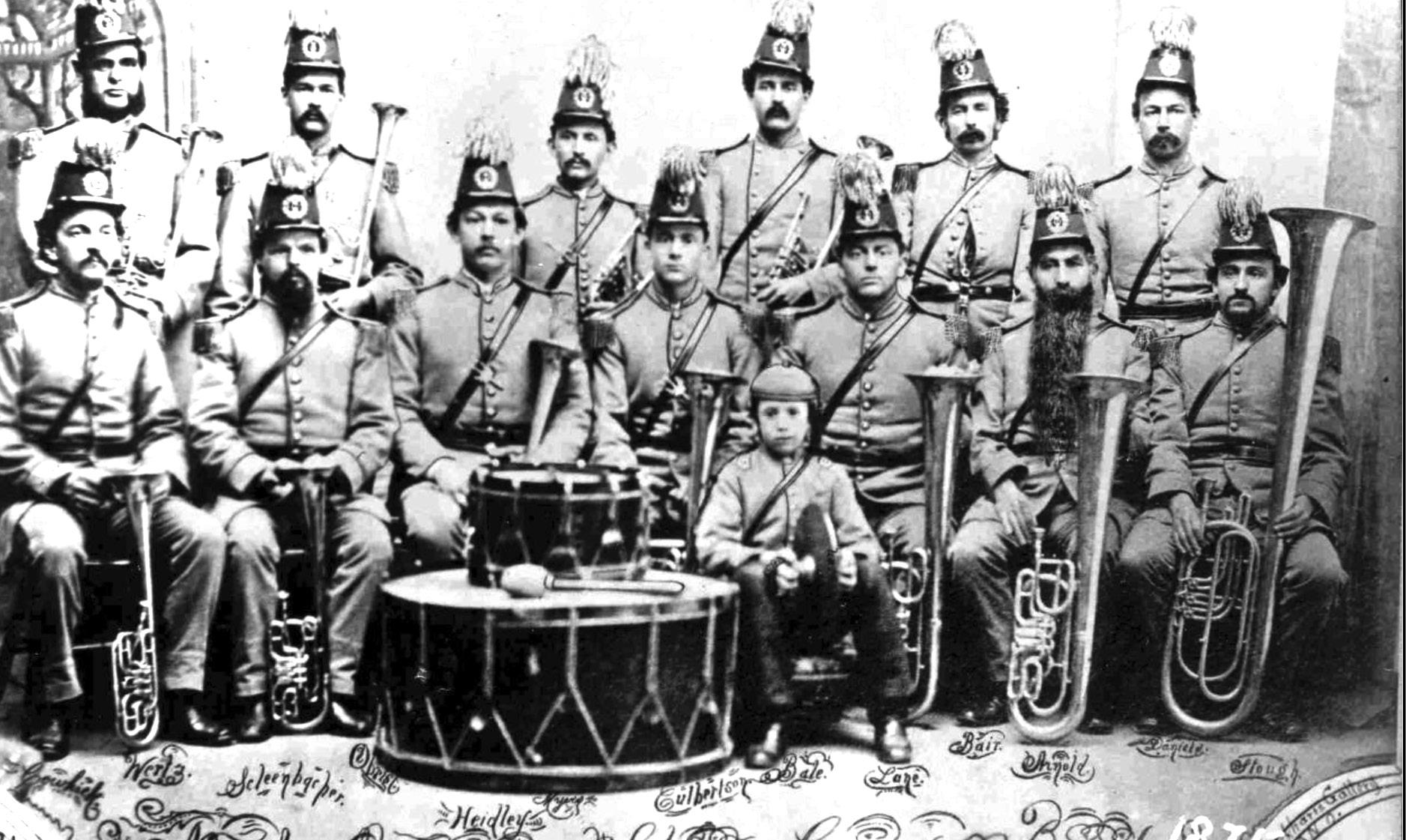 CITY BAND - The Bryan City Band has long played an active role in the community, entertaining untold numbers of people and performing at some of the area’s most important historical events. The band was founded in 1852, making it the second oldest municipal band in the nation. Over the years the band has appeared under many different names. This group known as the North Western Silver Cornet Band contained many of early Bryan’s prominent citizens. The members in the photograph are identified by last name except Medary Patterson (the boy holding cymbals), the son of Robert N. Patterson, editor of the Bryan Democrat newspaper. This image was taken by William Lockhart, one of Bryan’s early professional photographers, after the band was outfitted in new uniforms made by a Bryan tailor in 1875. (WCPL Photographic Archives.)