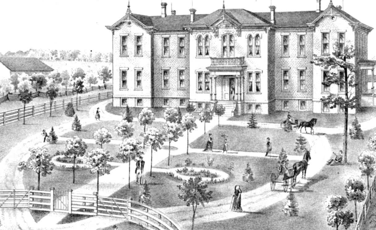 EARLY HISTORY - In 1874 Williams County constructed this two-story, 104- by 45-foot brick infirmary or “poor house” on a 200-plus-acre Jefferson Township site along County Road 16 north of County Road I.50. Cultivating crops and raising livestock on the surrounding farm helped offset the infirmary’s operating costs. In 1966 Hillside Nursing Home (now part of Hillside Country Living) was built to replace the infirmary; the 103-year-old structure was razed in 1977. (1874 Williams County atlas.)