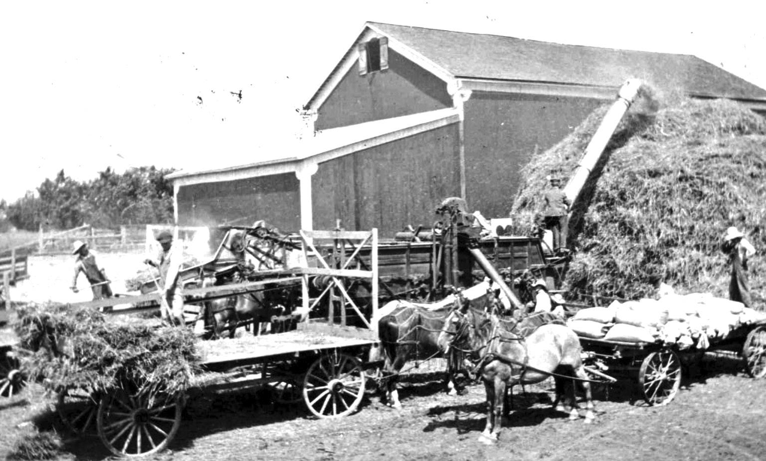 HARD WORK BEFORE MACHINERY - Local pioneers separated grain from straw and chaff with flails or trampling by animals. By the late 1800s threshing machines powered by steam engines were common. In this circa 1915 Edgerton-area photograph farmers use pitchforks to unload wheat bundles from a wagon into a threshing machine. The thresher filled bags with grain on the right, and blew straw into a stack at the rear.