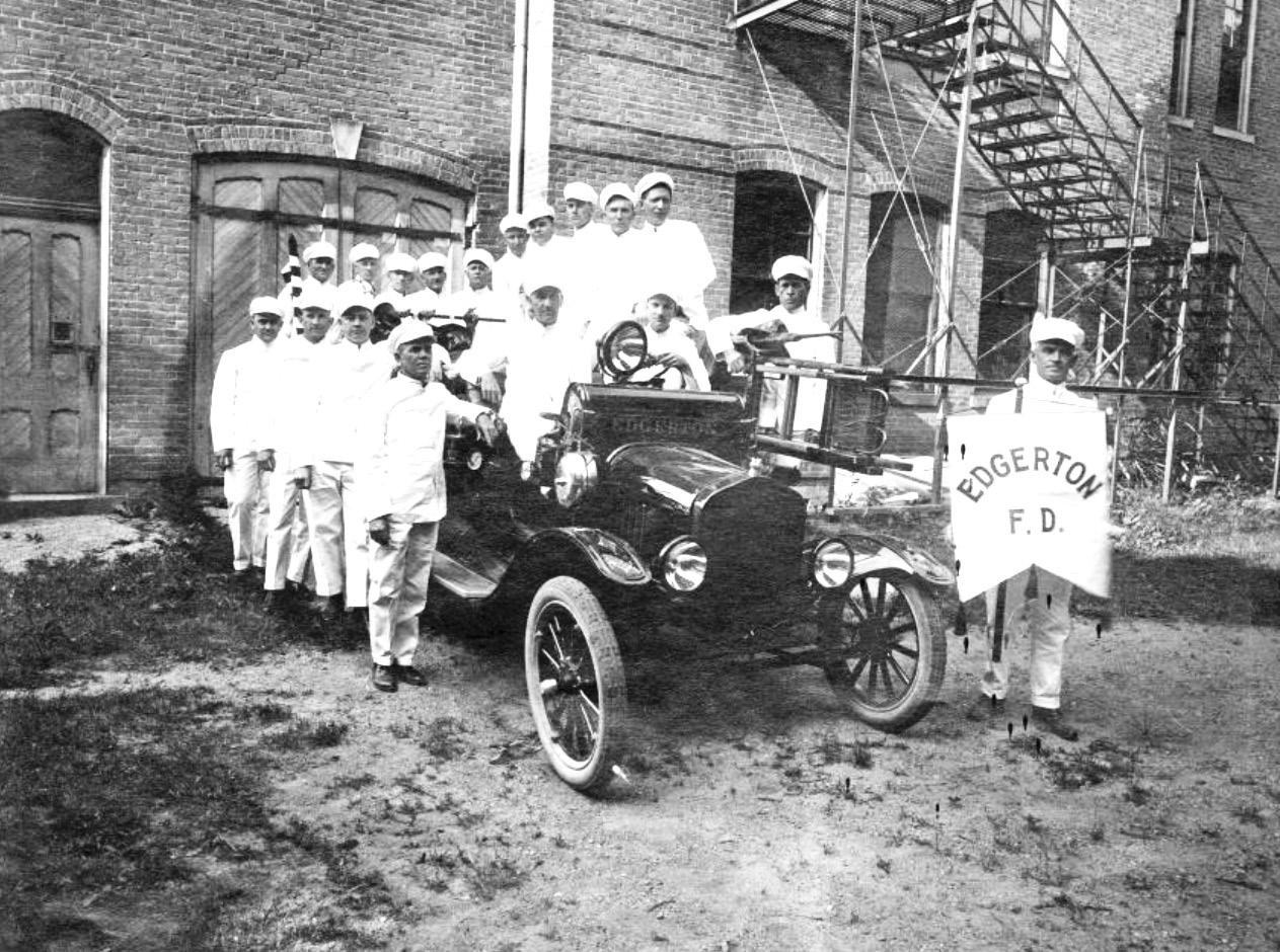 LITTLE GIANT - In the 1870s Edgerton purchased a “Little Giant” fire engine but experienced difficulty maintaining an organized fire department to operate it. In July 1893 fire destroyed the block northeast of Indiana Street and Michigan Avenue. The following year, Edgerton purchased Bryan’s used hand-pumped fire engine and organized a fire department. This undated photograph shows Edgerton firefighters in dress uniform at the firehouse next to Edgerton’s town hall. (Edgerton Historical Society.)