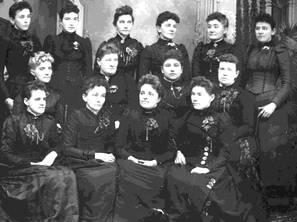 WEST UNITY WOMEN’S CLUB - West Unity’s first women’s club, the Olive Literary Society, was organized August 27, 1890, for study and research purposes. Members shown in this February 1892 photograph are, from left to right, (first row) Lydia Pettit, Alice Hoover, Josie Dodge, unidentified; (second row) Mary Morrison, Nora Bowman, unidentified, Mary Denman; (third row) Jessie Beatty, Nellie Carney, Ella Hollington, unidentified, Nettie Smith, unidentified. (WCPL Photographic Archives.)