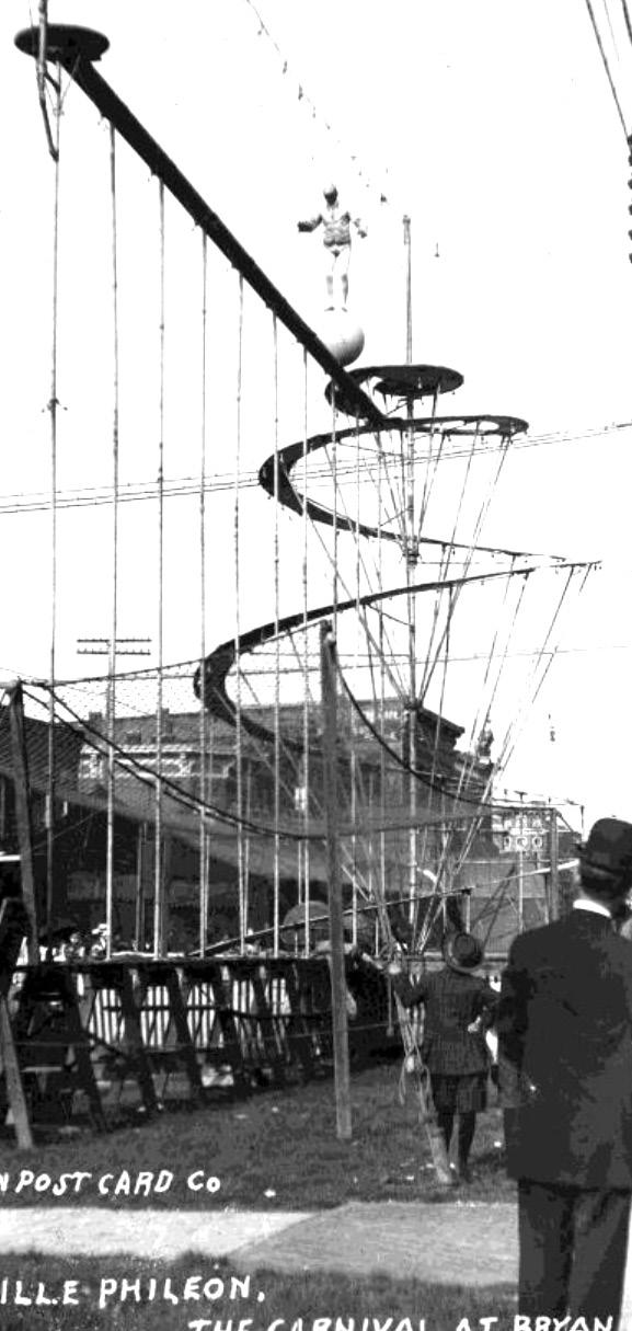 ENTERTAINMENT - Summer carnivals have long been a Williams County pastime. A highlight of the Bryan Merchant’s Carnival held June 29 through July 4, 1908, was free shows provided twice daily by “equilibrist” Achille Phileon. Outfitted in flashy jacket, cap and tights, Phileon balanced himself atop a large ball and using his feet, maneuvered the ball to the top of a narrow, spiraling ramp erected on West High Street.