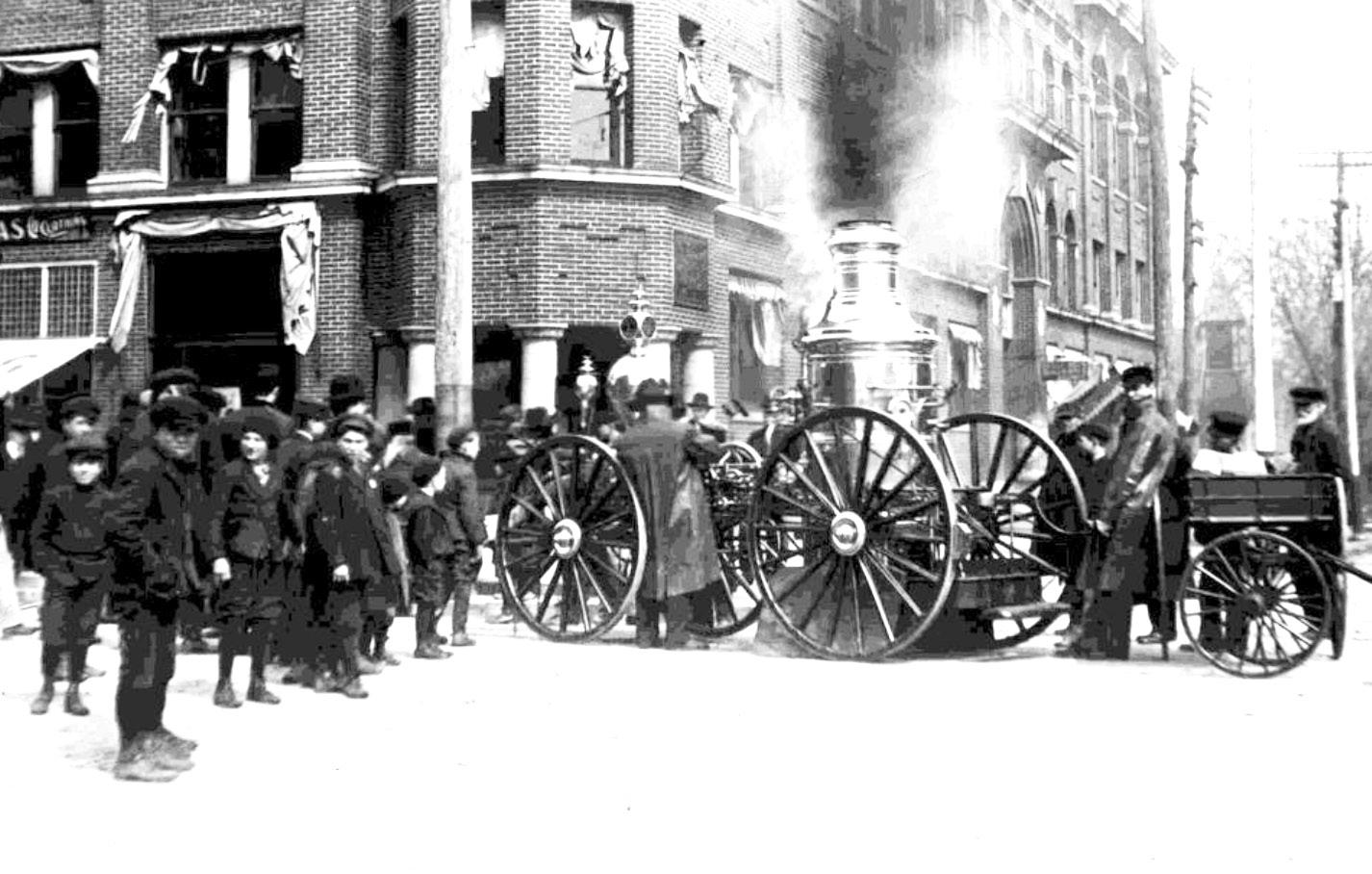 EARLY BRYAN FIRE DEPARTMENT - Bryan’s fire department was founded December 18, 1857, as a hook and ladder company. In 1863 the village acquired a used manual fire pumper and in 1875 purchased this Patterson steam fire pumper to complement the hand-pumper. The Patterson steamer was replaced in 1918 by a used American LaFrance Metropolitan steam engine. This 1908 photograph shows the Patterson steamer working at Main and High streets. (WCPL Photographic Archives.)