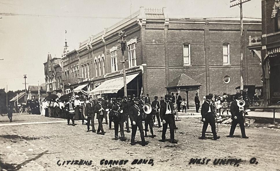 TOWN BAND - Evansport had a town band as early as 1875. Band members in this circa 1900 photograph are, from left to right, (first row) unidentified snare drummer and bass drummer John Christy; (second row) Charles Snyder, Wagner (leader), Ed Williams, Jim Christy, Jack Snyder, Claude Woodward, and Charles Schroeder; (third row) Mann, William Snyder, Sam Masters, Elmer Christy, Ed King; (fourth row) Porter Cameron, Homer Hall, Emery Snyder. (WCPL Photographic Archives.)