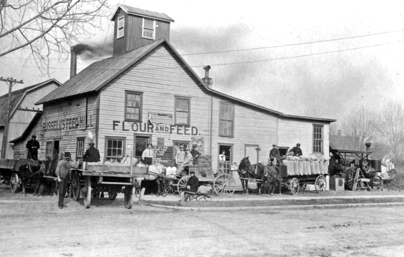 BRYAN MILL - Russell’s Mill was located on the north side of East Wilson Street in Bryan between Walnut and Cherry streets. The mill produced livestock feed and flour. In 1920, J. W. Russell completed a new three-story brick mill building on the southwest corner of Mulberry and Garden streets next to the Cincinnati Northern Railroad. (WCPL Photographic Archives.)