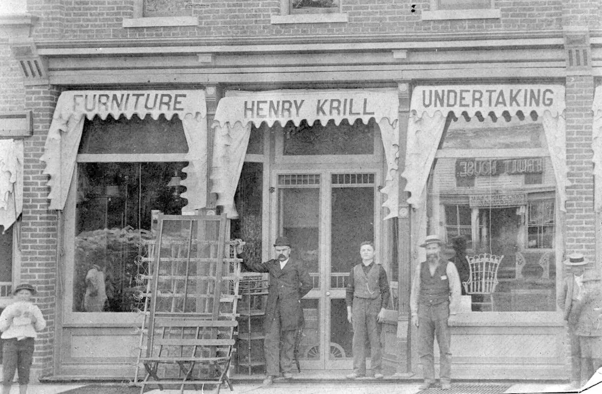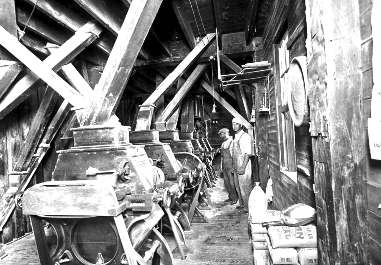 WEST UNITY MILL - John Zimmerman operated the West Unity Flouring Mills at West Jackson Street and U.S. 127 from 1905 to 1935. The mill was originally equipped with millstones and later converted to the roller mill process. Zimmerman delivered his “Favorite” brand flour to area families, grocers and bakers. Zimmerman (left) and an unidentified worker are shown inside the building next to the roller mills. (WCPL Photographic Archives.)