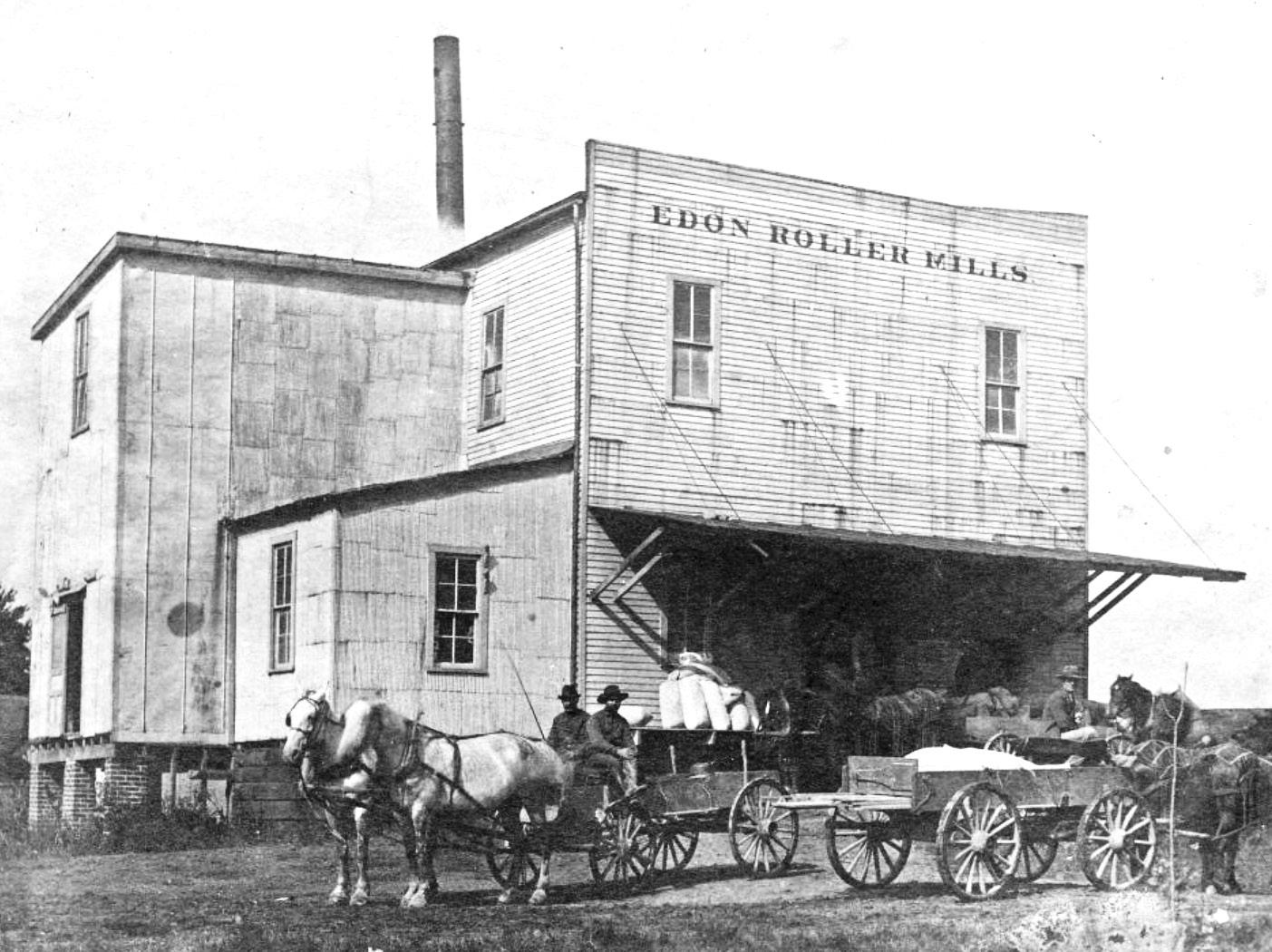 TAMING THE WILDERNESS - Mills were among Williams County’s first businesses and helped tame the wilderness. Sawmills supplied lumber that was used to replace crude log structures with frame buildings, considered a great step of progress at the time. Gristmills offered a market for locally-grown grain and produced cornmeal and flour, essential parts of a settler’s diet. Mill products were considered valuable commodities, and people traveled many miles under difficult circumstances to secure them. Early mills harnessed the power of creeks or rivers; later boilers, gasoline engines and electricity were used. The first local gristmills ground grain between two millstones. By the 1880s, roller mills that used metal rollers to produce finer, more consistent flour began to appear. This circa 1910 photograph shows the Edon Roller Mills.