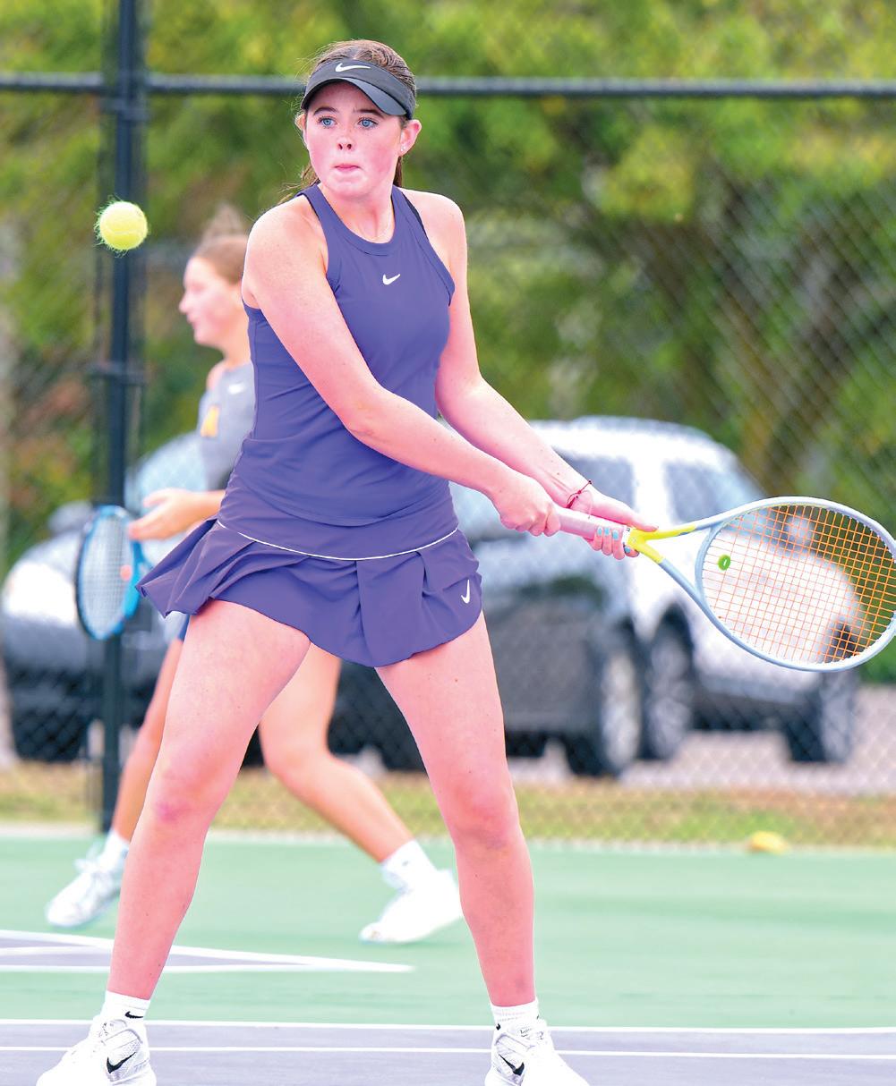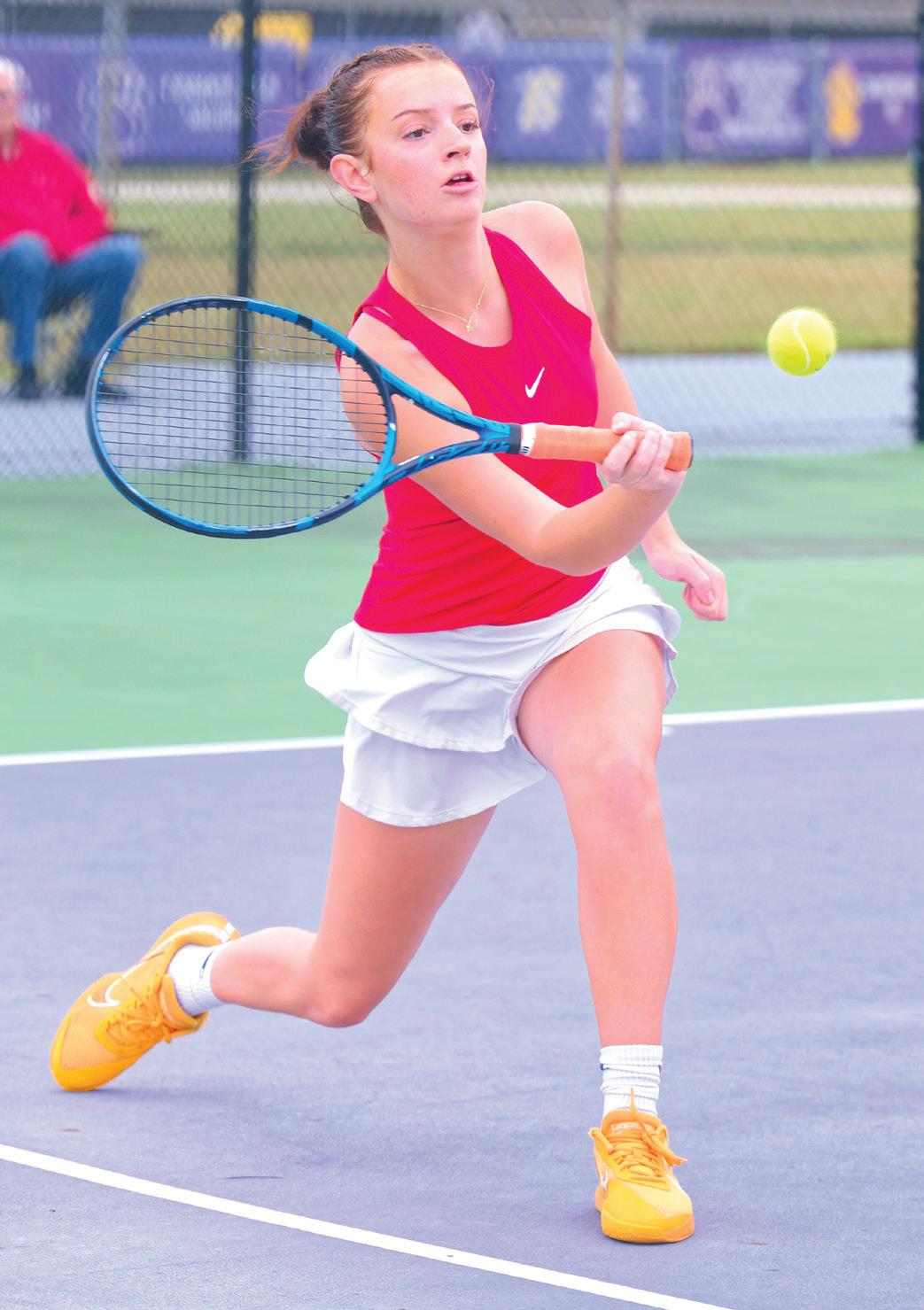 SECOND SINGLES … Emma Kesler (Wauseon) plays a shot during a first round match on Friday at Bryan in the NBTL tournament. VIEW 199 PHOTOS OF THIS CONTEST FOR FREE AT WWW.THEVILLAGEREPORTER.COM