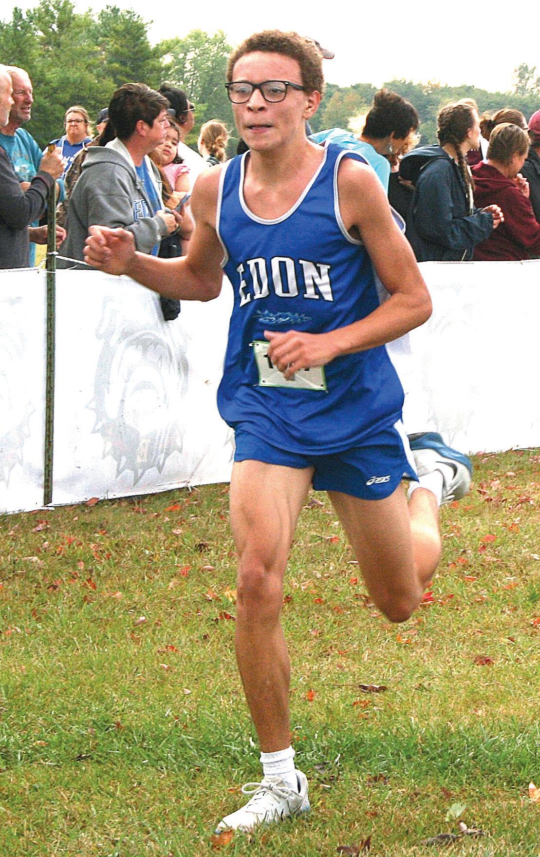 EDGERTON INVITE ... Edon's Eli Snyder runs to the finish line at Miller Park last Saturday in the Edgerton Invitational.
