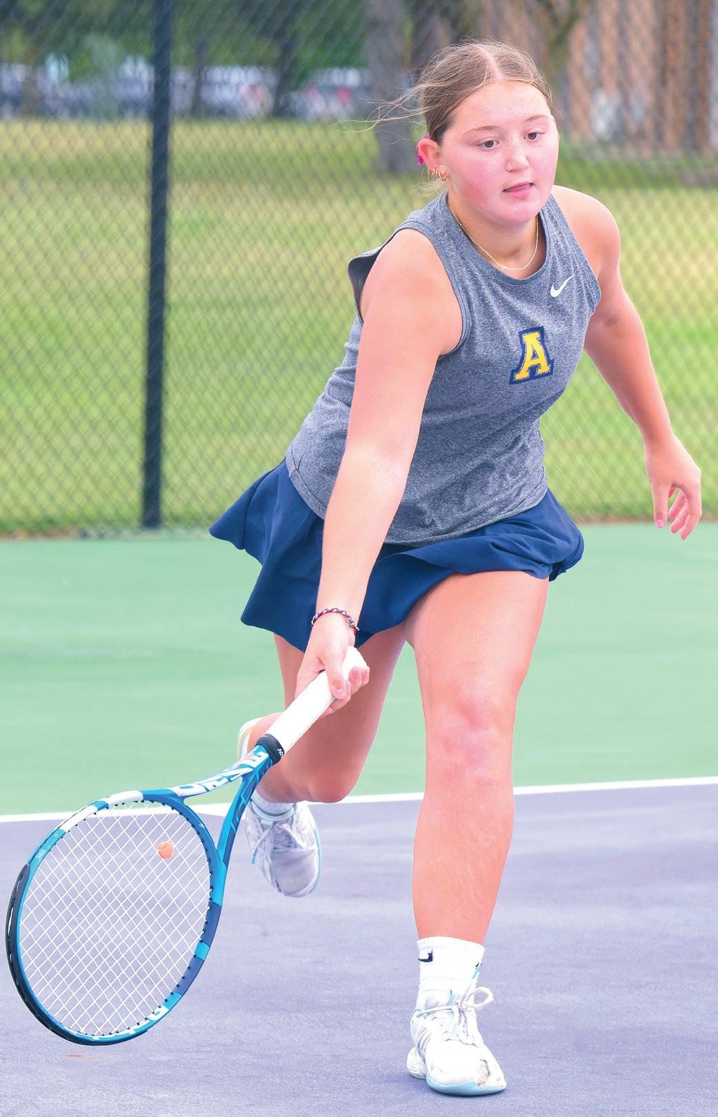 7-6 (3), 3-6, 10-7); 2. Schroeder (TC) d. Hug 6-0, 6-0; 3. Brennan (A) d. Hurner 4-6, 6-1, 11-9; DOUBLES: 1. Nafziger/ Gerken (A) d. Blevins/Knierin 6-0, 6-0; 2. Stuckey/Ryan (A) d. Smith/Coley 6-0, 6-1