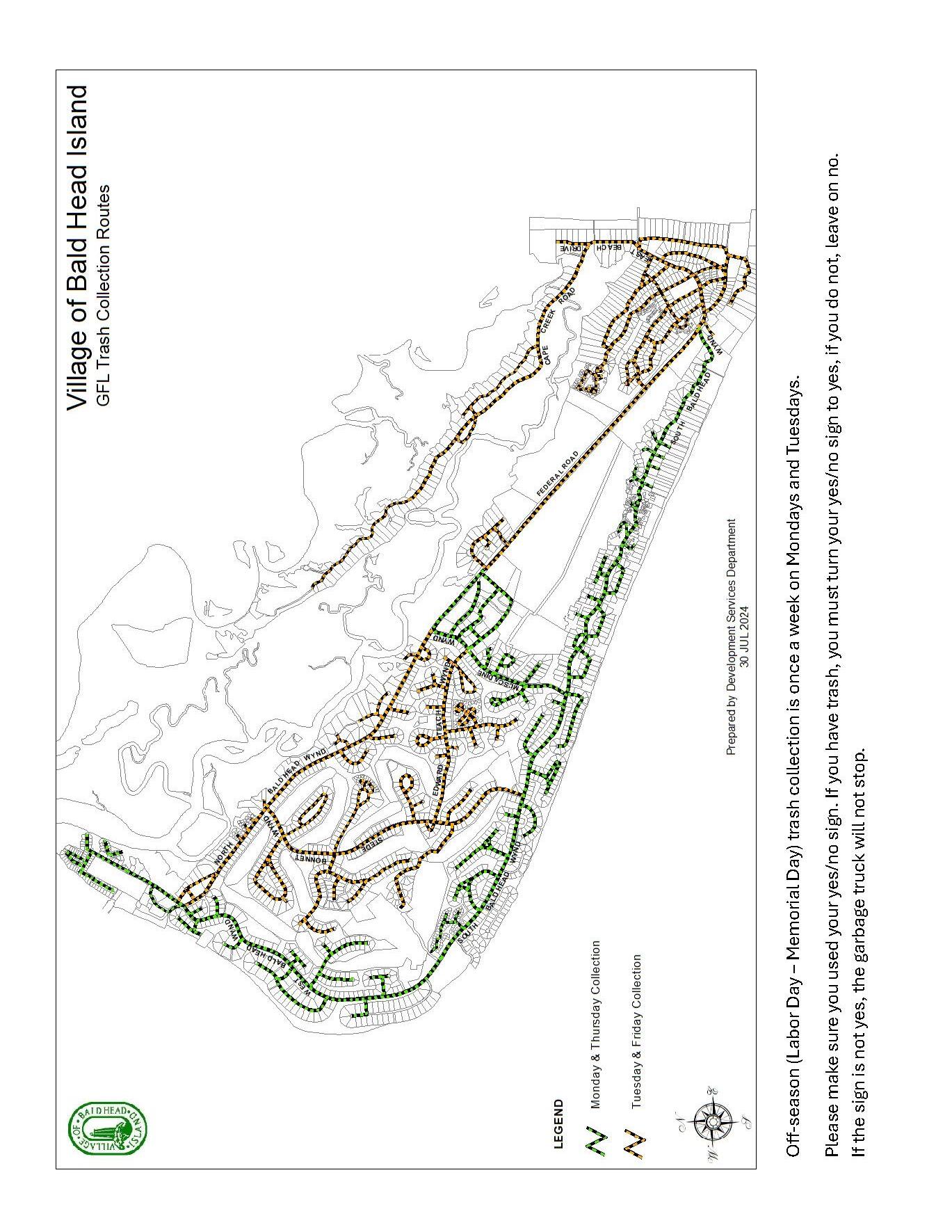 Trash Collection: Trash collection is twice a week between Memorial Day and Labor Day (in-season) and once a week between Labor Day and Memorial Day (off-season). The Village is split into two pick-up routes, so pick-up days vary based on the area serviced.