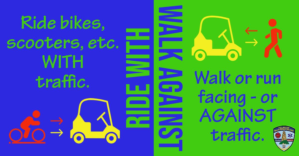 Pedestrian Guidelines: Pedestrians should walk against traffic to see approaching vehicles and bikes. They should stay off or as close to the side of the asphalt pavement as possible to avoid impeding traffic.