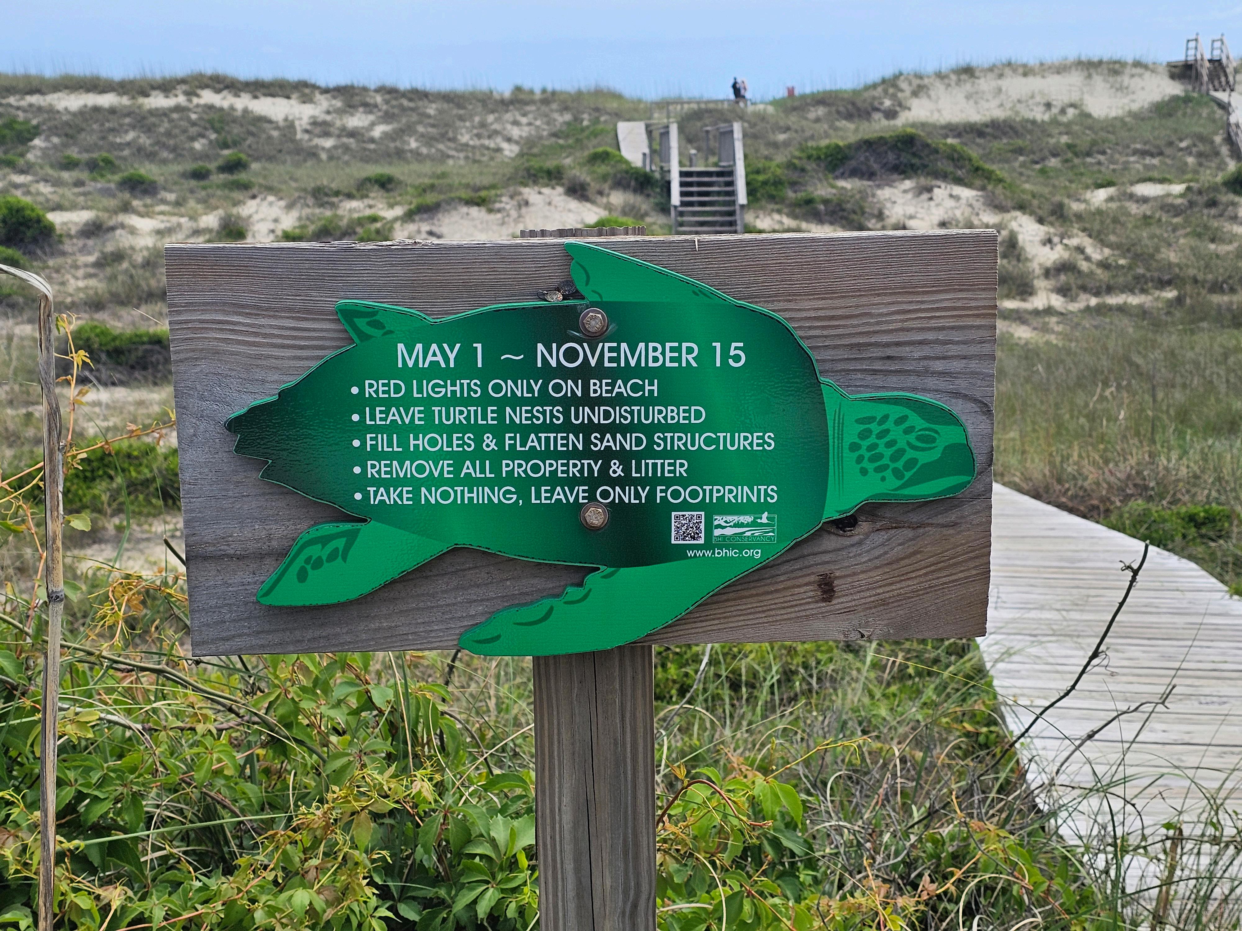 Nighttime Safety and Sea Turtle Protection: The island is very dark at night due to efforts to minimize light pollution and protect sea turtles. Individuals walking at night should wear bright or reflective clothing and carry a flashlight. Red lights are the only lights permitted on the beach between May and October.