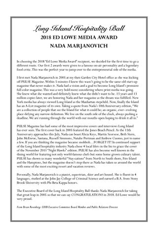 Long Island Hospitality Ball 2018 ED LOWE MEDIA AWARD NADA MARJANOVICH In choosing the 2018 “Ed Lowe Media Award” recipient, we decided for the first time to go a different route. Our first 2 awards were given to a famous on-air personality and a legendary food critic. This was the perfect year to jump over to the entrepreneurial side of the media. I first met Nada Marjanovich in 2005 at my then Garden City Hotel office as she was kicking off PULSE Magazine. Within 5 minutes I knew this wasn’t going to be the same old start-up magazine that never makes it. Nada had a vision and a goal to become Long Island’s premiere full color magazine. This was a very bold move considering where print media was going. She knew what she wanted and definitely knew what she didn’t want to be. 13 years and 13 million copies later, we are honoring Nada and her magazine as the dream was fulfilled. New York media has always viewed Long Island as the Manhattan stepchild. Now, finally the Island has an A-List magazine of its own. Taking a quote from Nada’s 10th Anniversary edition, “We are a collection of people that see the Island for what it could be; an organic, ever- evolving place defying any narrow definition. We live on the south side of the clock, always pushing a deadline. We are running through the world with our mouths open hoping to drink it all in.” PULSE Magazine has had some of the most impressive covers and interviews Long Island has ever seen. The first cover back in 2005 featured the Jones Beach Pencil. As the 13th Anniversary approaches this July, Nada can boast Alicia Keys, Martin Scorsese, Beth Stern, John McEnroe, Santana, Russell Simmons, Natalie Portman and Andrew Cuomo, just to name a few. If you are thinking the magazine became snobbish…FORGET IT! In continued support of the Long Island hospitality industry Nada chose 4 local lifers in the biz to grace the cover of the November 2011 “Night Hawks” edition. PULSE has also become well known in the dining world for featuring not only world-famous chefs but some home grown culinary talent. PULSE has shown us many wonderful “Stay-cations” from North to South shore, Fire Island and the Hamptons, but the magazine doesn’t stop there as Nada has taken us around the world with some of the most exciting resort and vacation reviews. Personally, Nada Marjanovich is a pianist, equestrian, skier and art hound. She is fluent in 4 languages, studied at the John Jay College of Criminal Science and earned a B.A. from Stony Brook University with Phi Beta Kappa honors. The Executive Board of the Long Island Hospitality Ball thanks Nada Marjanovich for taking that great leap in 2005 so that we can say CONGRATULATIONS in 2018. Ed Lowe would be very proud. From Brian Rosenberg- LIHB Executive Committee Board Member and Public Relations Director