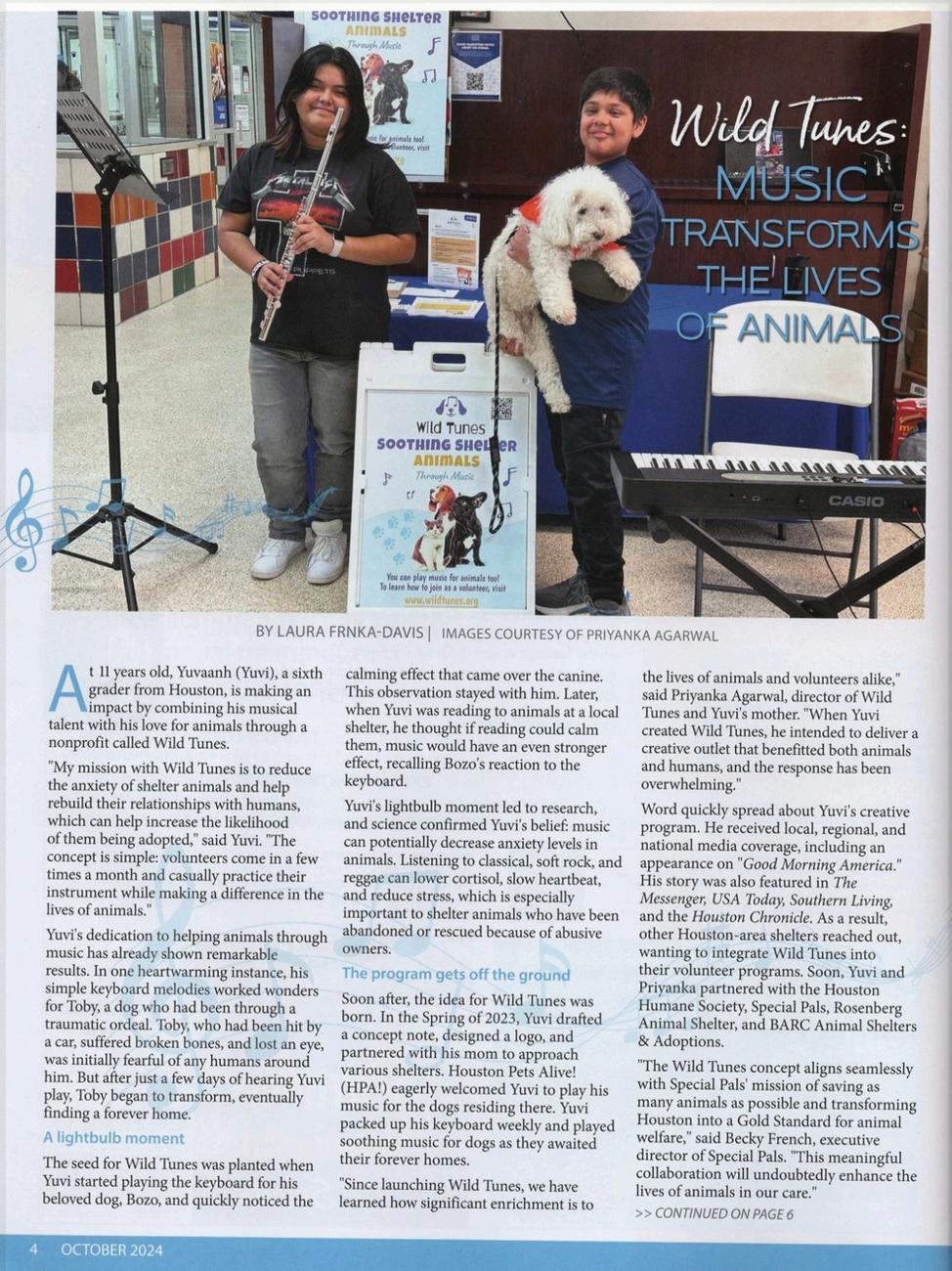 Wild Tunes is a 501(c)(3) non-profit dedicated to soothing shelter animals through the power of music It was founded by Yuvi Agarwal, an animal lover and musician, when he was 10 years old. Wild Tunes has received extensive news coverage on prominent platforms such as ABC’s Good Morning America, USA Today, The Messenger, KHOU-TV, KPRC-TV, and Southern Living, among others