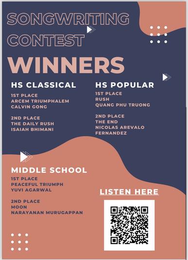 PleasejoinusonWednesday,April24th,tohearthewinnersof theSoloandEnsembleContestperformtheirwinningpieces YoucanhearthetracksfromtheSongwritingcontestonthe providedlinkorQRcodeontheannouncement Thankyoufor yoursupport,andcongratulationstothewinners!