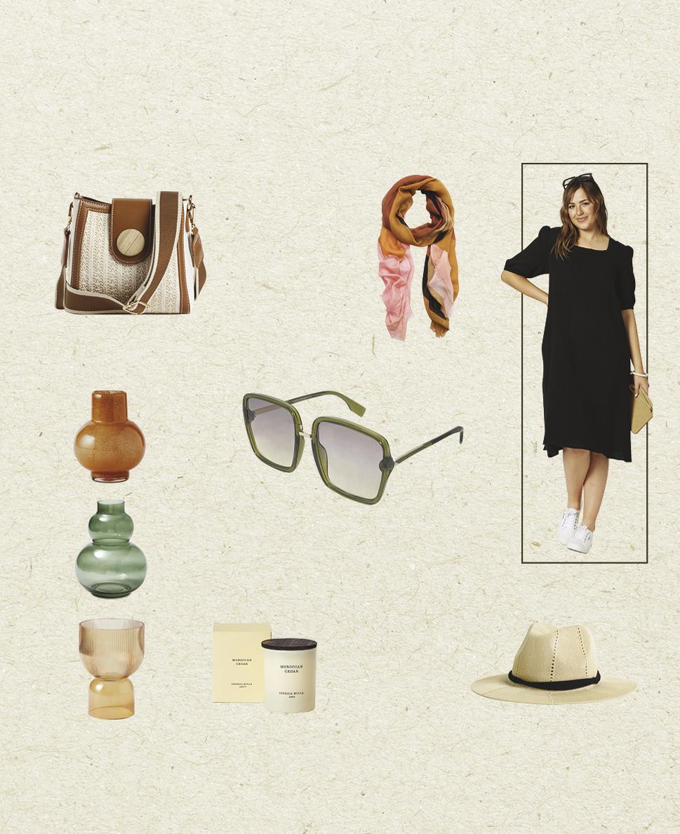 Clockwise from top left: Sussan cross body bag in Tan, $39 95 Carolina Leblon multi-colour scarf, $89 99 Rodney Clark square-neck cotton dress in Black $99 95 Decjuba, ‘Capri’ woven fedora in Natural $39 95 Blue Illusion ‘Cereria’ Molla Cedar candle $39 99 Bed Bath N’ Table vases from top Marlo small round glass vase $39 95, Camden large glass vase, $39 95, Macy glass vase in Amber, $49 95 Carolina ‘Marley sunglasses in Olive, $79 99