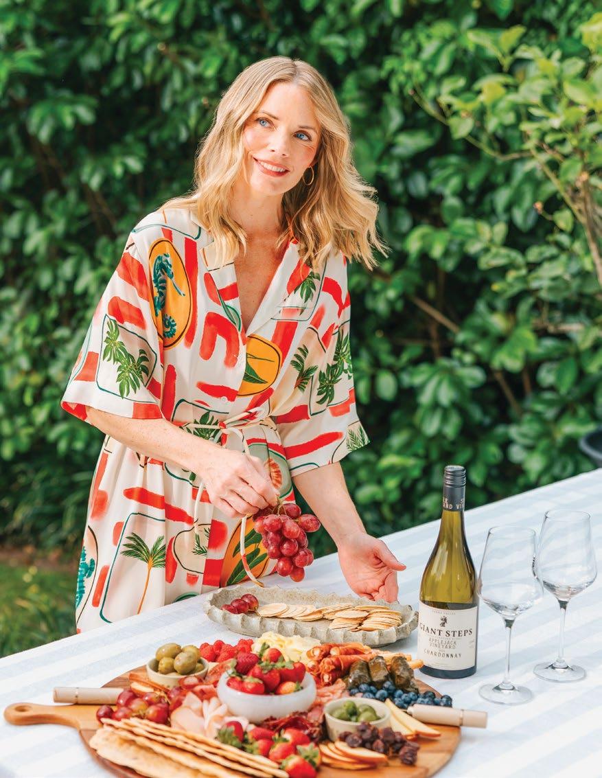 Pictured from left to right: Kit wears: Sportscraft Liberty blouse, blue multi, $199.99. Liberty mini skirt, blue multi, $199.99. Witchery Mindy mesh flats, fresh white, $159. Lily wears: Cable Melbourne Sandpiper linen top, dark sage, $199. Sandpiper linen skirt, dark sage, $299. Country Road Tessa sandal, oat milk, $159. Bed Bath N’ Table Savona dinner plates, $16.95. Savona breakfast bowls, $12.95. Acacia salt and pepper mills, $29.95. Faux lemon & orange sprigs, $14.95 each. Montclair jug, pink, $29.95. Kitchen Stop Long wooden board, $94.95. Musango pitcher, orange, $115.00. Oil pourer, $49.95. Crystal tumblers, $265. Large drinks tray, $79.95. Book Face Here’s How the Emmy tea towel, olives, $19.95. Porter’s Liquor Aperol, $34.99.