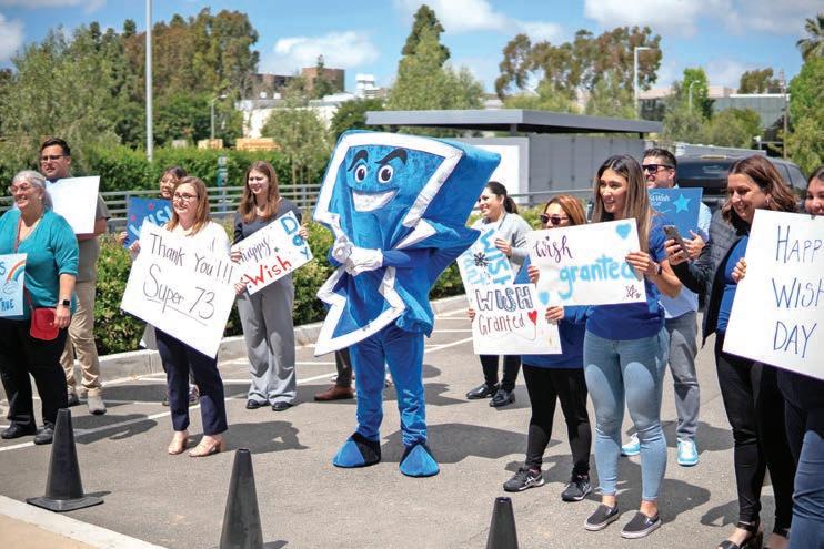 The Super73 mascot celebrates with Make-A-Wish recipient Gavin Valencia in Irvine Tuesday, May 2, along with his mother Stephanie Paramo and her fiancé Jay Rodriquez. Valley News/Super73 photo