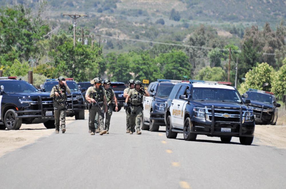 deputies were seen bearing lethal and less-lethal weapons, according to residents. Bahrman Road was closed as the area was carefully searched.