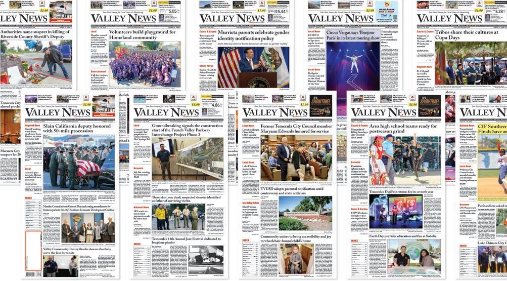 VISIT V myvalleynews.com June 14 – 20, 2024 Volume 24, Issue 24 A Section Your Best Source for Local News & Advertising S ERVING TEMECULA , MURRIETA , L AKE E LSINORE , M ENIFEE , WILDOMAR , H EMET, SAN JACINTO AND THE SURROUNDING COMMUNITIES PRSRT STD US POSTAGE PAID HEMET, CA PERMIT #234 USPS Postal Customer VALLEY NEWS $2.00 Anza Valley Outlook D-1 Business B-7 Business Directory B-7 Calendar of Events A-11 Classifieds B-8 Education B-6 Entertainment A-10 Graduation C-1 Health B-4 Home & Garden B-5 Legal Notices D-6 Local A-1 National News A-9 Opinion.............................A-7 Regional News A-8 Sports B-1 INDEX Temecula Valley students receive Student of the Year honors, B-6 Local News see page A-2 Local News see page C-4 Local high school athletes shine as 2023-24 All-CIF selections, B-1 Graduation Edition Class of 2024 See our local graduates starting on C-1 Julie Reeder Publisher Residents on Arron Ct. in Murrieta, are grappling with persistent excessive groundwater issues, which they claim the city authorities attribute to a newly emerged natural spring on their properties. Despite numerous pleas for assistance, they claim the Elsinore Valley Municipal Water District and the City of Murrieta have distanced themselves from the problem, leaving homeowners frustrated and seeking resolution. Pamela Race,