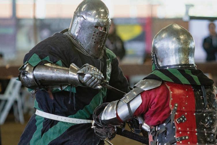 Armored fighters battle against each other using a variety of blunt weapons in a 5 vs. 5 melee during the Historical Medieval Battle event in Temecula. Participants at the event, held Feb. 5, 2022 at the California Ranch Company, are covered in real metal armor and blunt metal weapons are used in an effort to prevent injury and damage to armor.