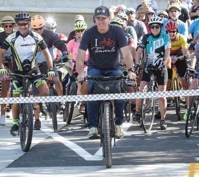 Temecula Mayor Pro Tem Zak Schwank, center, rides a bike through check ered tape with other cyclists in the community to celebrate the completion of the Santa Gertrudis Creek Interconnect Trail construction, Oct. 1, 2022.
