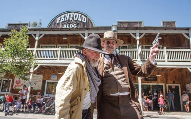Old Town Temecula Gunfighters perform on Front Street while marching in the 2022 Temecula 4th of July Parade.