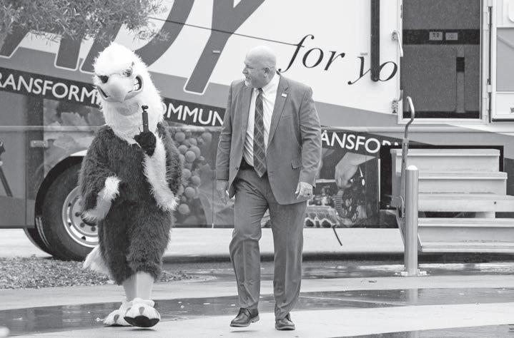 Mt. San Jacinto College Superintendent/President Dr. Roger Schultz arrives at the Temecula Valley Campus alongside Ernie the Eagle to conclude the Driving Transformation Tour. Valley News/Courtesy photo
