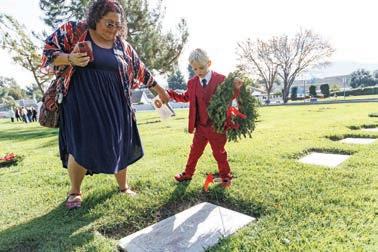 [Left] Alison Runion with her son Thomas, 4, place wreaths at the gravesites of veterans during the Wreaths Across America event at the Temecula Public Cemetery in December 2023.