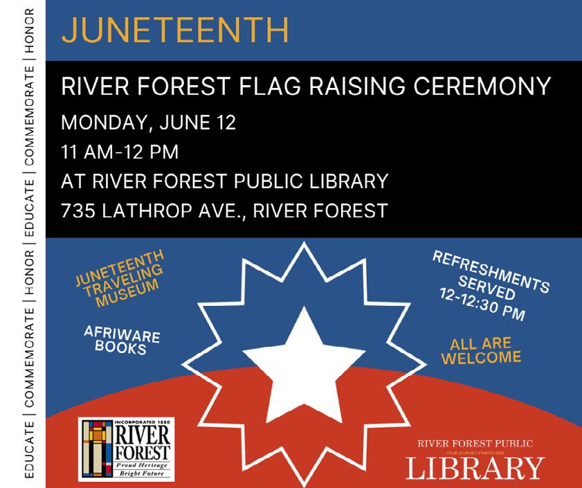 Join the Village and the River Forest Public Library for The Juneteenth Flag Raising Ceremony on Monday, June 12 starting at 11 a.m. until noon at the River Forest Public Library. This event commemorates the date in 1865 when General Order #3 proclaimed the freedom of the enslaved people in Texas.