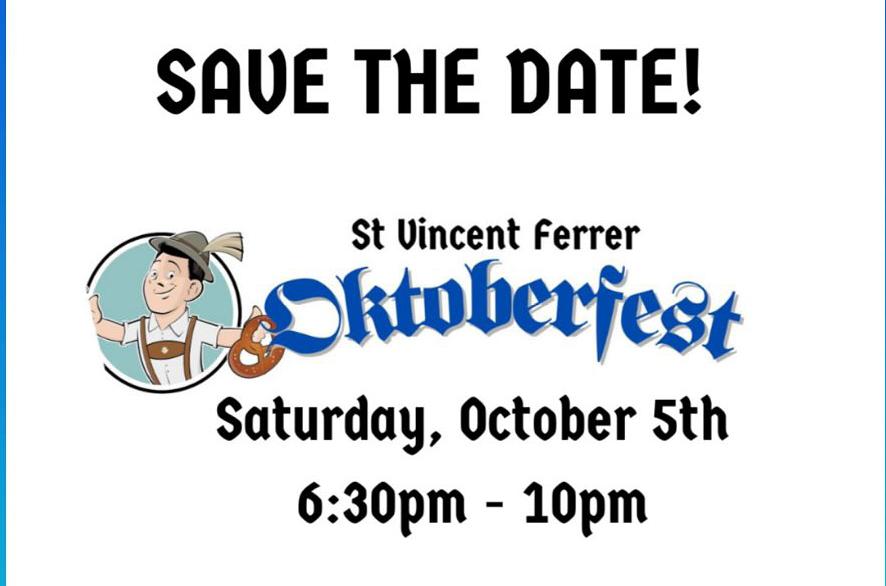 Join St. Vincent Ferrer Parish for their annual Oktoberfest Saturday, October 5 from 6:30 - 10 p.m. in their Parish parking lot. The event will offer traditional German food from Edelweiss Restaurant, games, raffles, a DJ and more! You must be 21 years of age or older to attend this event - and more information and ticket links will be coming soon!