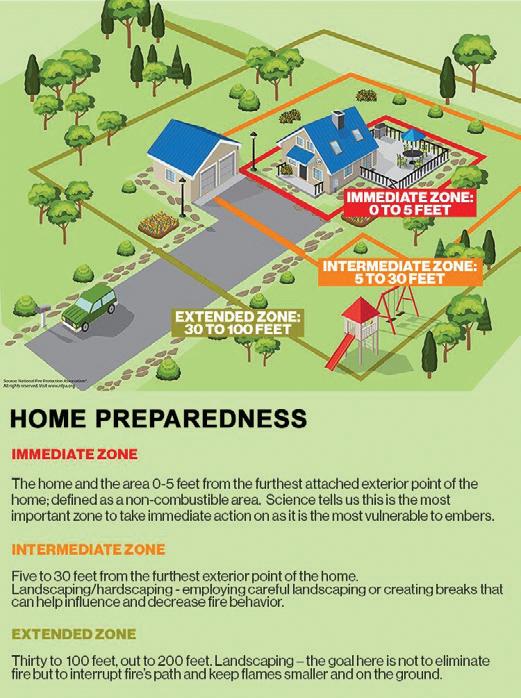 » Homes should be cleared of all dead vegetation including pine needles, leaves and firewood piles for 30 feet or to the edge of property. Firewood may be covered with a fire-retardant covering that prevents any spark from getting to the firewood.