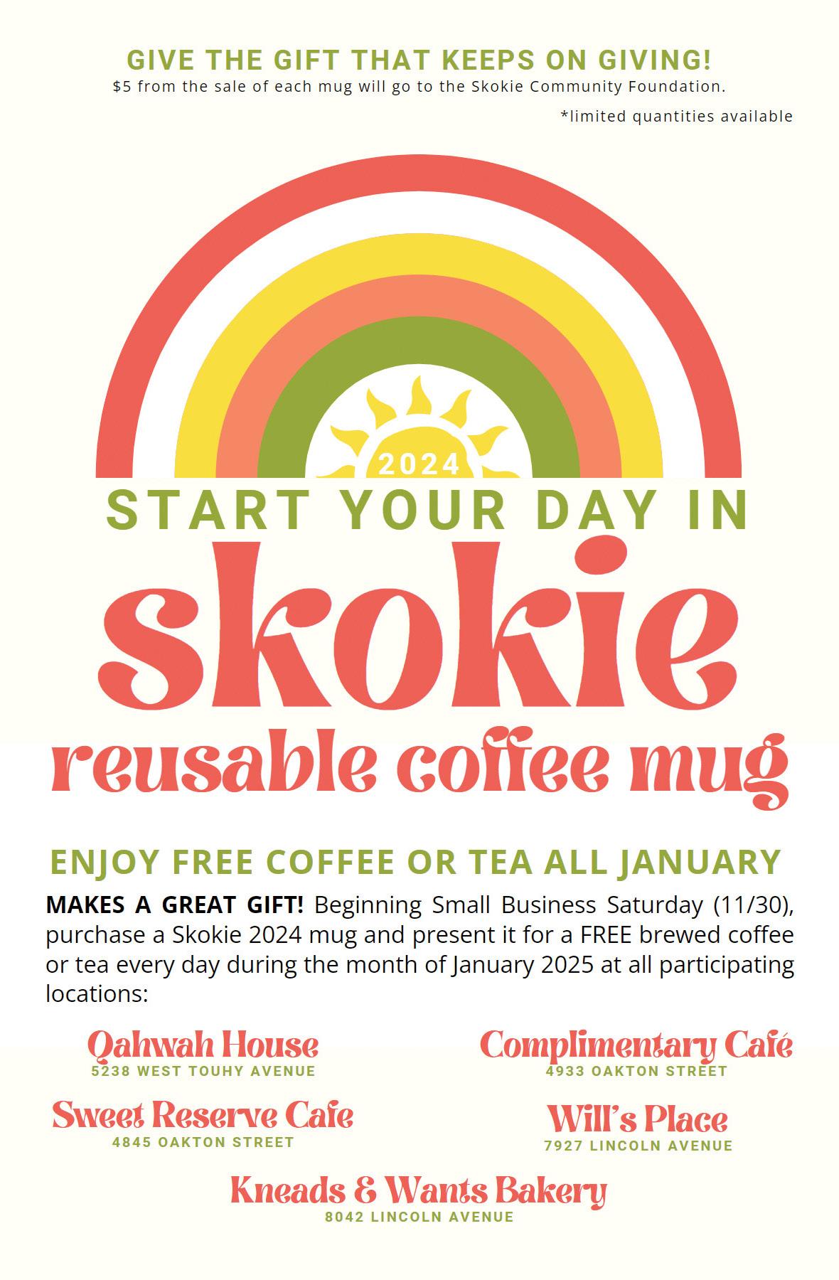 Beginning Small Business Saturday (November 30), shoppers can purchase a stylish reusable coffee mug at participating Skokie locations and enjoy free coffee or tea all January 2025!