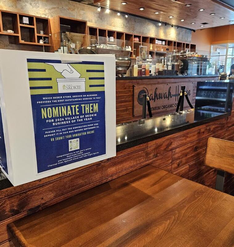 • Complete a paper nomination form at the 2023 Skokie Business of the Year (Soul Good Coffee) or honorable mentions (Qahwah House, Take Flight Spirits, or Charcoal Oven)